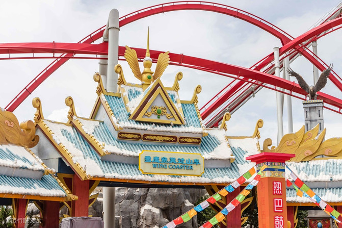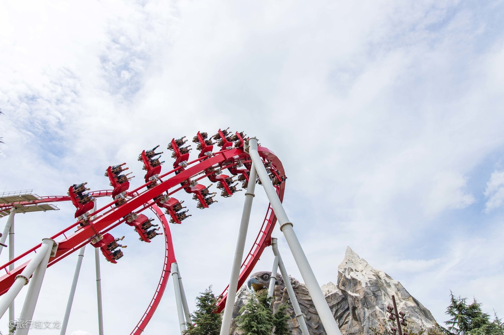 再来说一下红色的过山车,轨道和场景是以 梅里雪山 和雪鹰造型打造的,过山车叫做雪鹰宽翼过山车还是很合适的。也是我这次去体验的过山车,这样的360度旋转滚动,十分的刺激,想睁眼看的但是失重的感觉却让我紧闭双眼,再次疯狂的尖叫着,但是发现身旁的人叫的比我更大声,由尖叫就变成了傻笑。