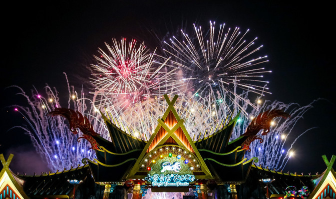 烟花在夜空绽放的美丽映着欢乐世界园区的灯光,让这个夜更加迷人了。甚至让人感到快乐而惆怅,真得舍不得离开呀。