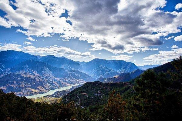 这张照片想说点上车,继续前进。坐着坐着,哥已经麻木了。不仅脑袋麻了,屁股也麻了...泸沽湖还不知道在多远的前方,这时候,我真的不得不佩服那些修路的工人们,你们实在太厉害了... 脑袋麻木,不知道过了多长时间,司机大哥在一个地方停了下来,转头跟我们说,这里望下去就是**江,还有不知道是山路十八弯还是多少弯(脑袋晕,记不住了),大家可以下来拍拍照。 来之前我并没有想过我们会经过**江,顿时兴奋莫名。下车一看,也是醉了...我觉得我并没有把**江的色彩表现出来,他就像一条蜿蜒的翡翠一样镶嵌在这一片立体的土地上。他是那么的安静,以至于远看时你几乎发现不到他是否在流动。 司机大哥说我们会沿着眼前这九曲十三弯的山路去到**江的对面山...前面,还有数不尽的山要翻啥?…