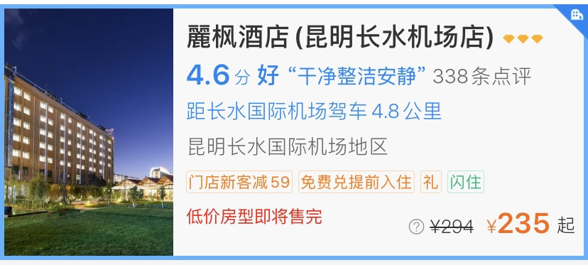 说走咱就走。到了昆明机场快接近凌晨一点了(毕竟红眼航班实惠) 起飞前在某程上订了机场附近的酒店 麗枫酒店(长水机场店) 酒店有免费的接送机服务 十多分钟就到了 司机大哥老好了