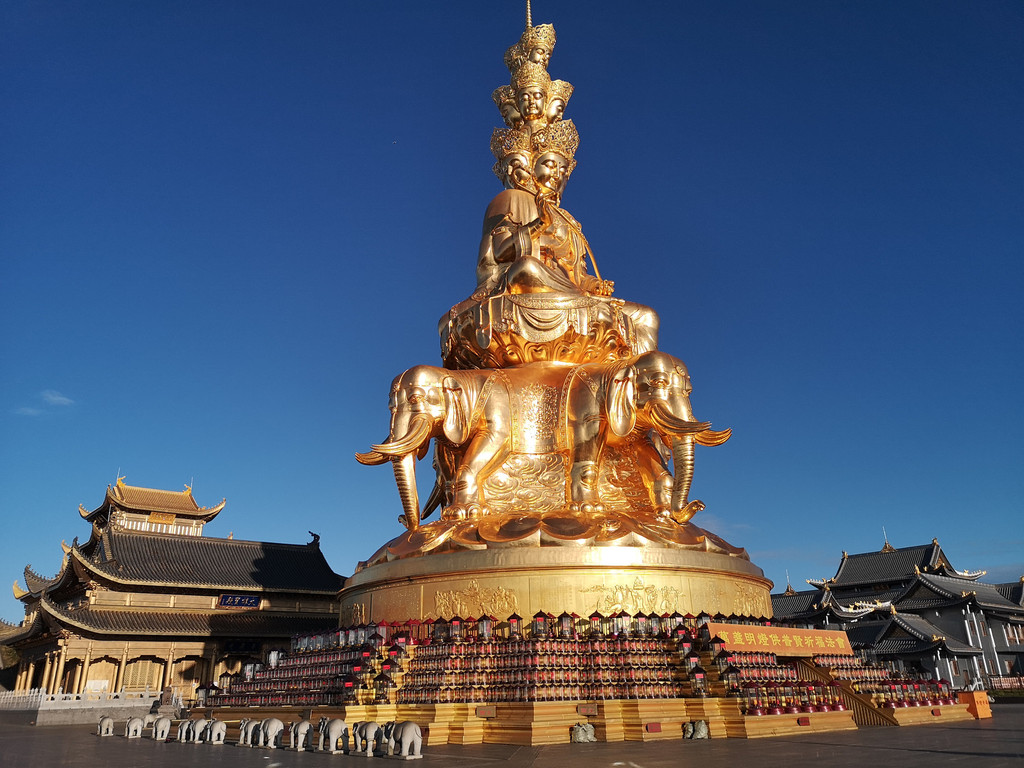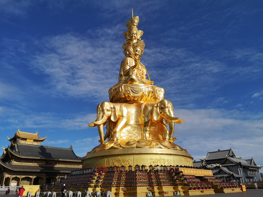 我们的运气不错,到金顶的时候天放晴了。还未登上金顶,便可看到阳光下的四面十方普贤金像分外耀眼。登上高高的石阶,地势豁然开朗,高高矗立的四面十方普贤金像与金顶在蓝天白云的映衬下熠熠生辉。