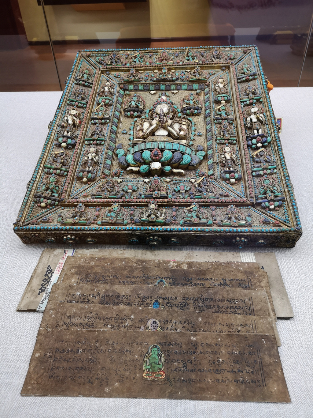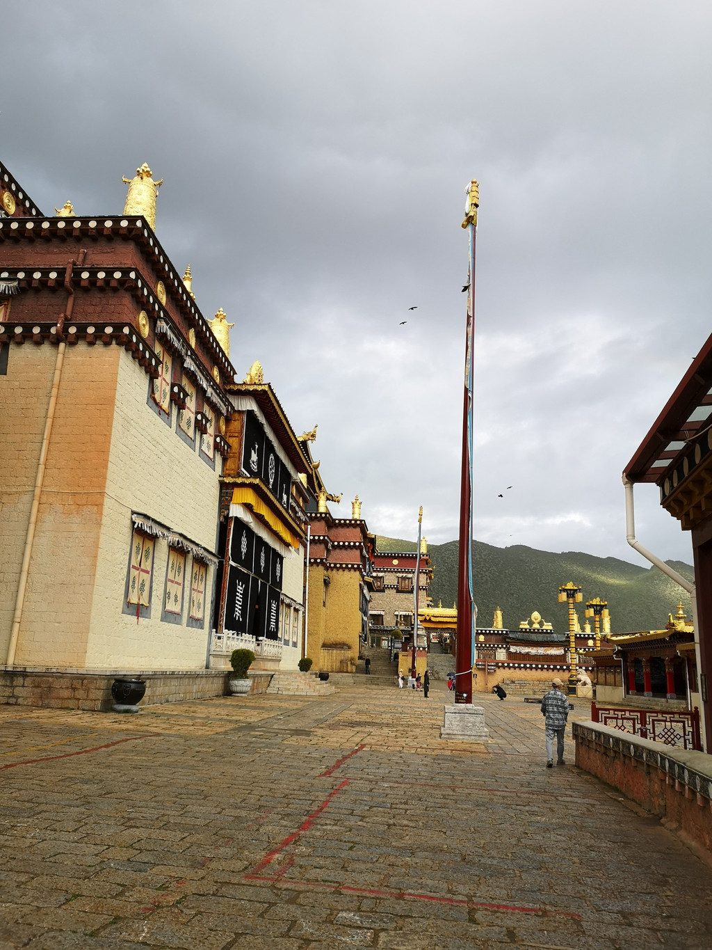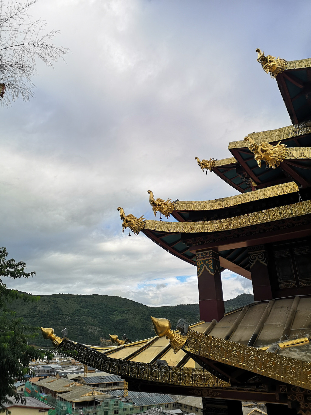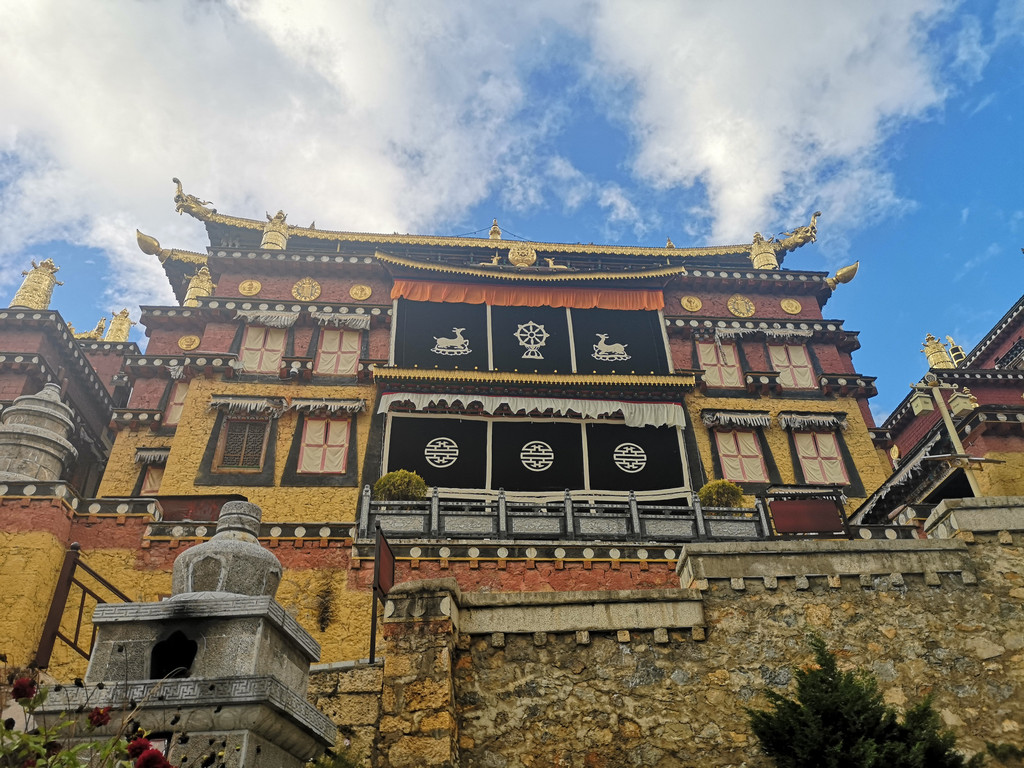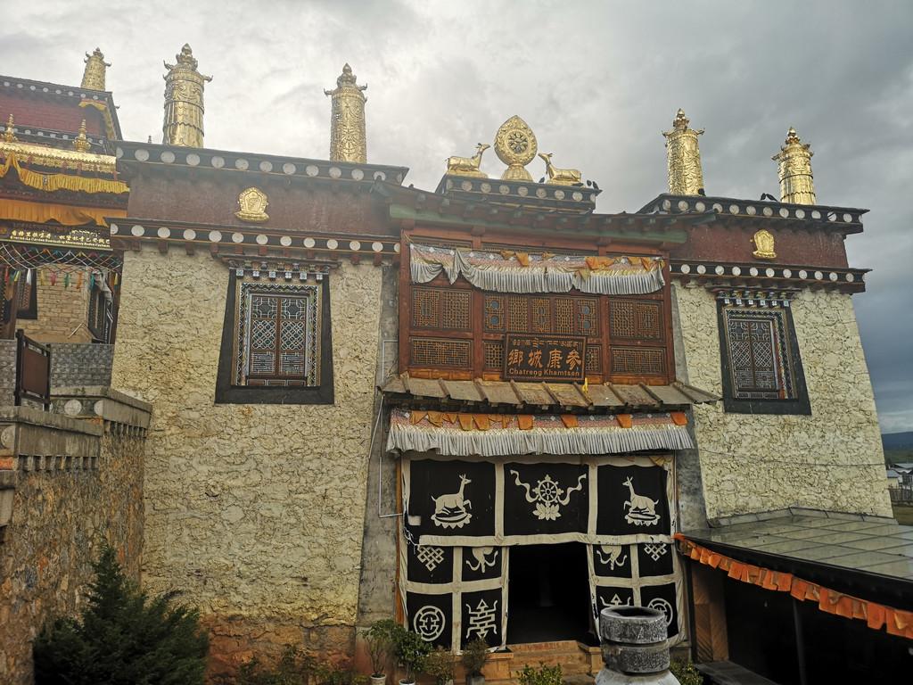 寺庙内建筑的外墙上装饰着佛像、瑞兽和莲花等图案,都是鎏金的,显得金碧辉煌。