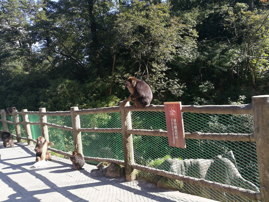 等到太阳完全升起,我们便心满意足地返回酒店。吃过早饭,我们准备下山。在索道上站附近的一个观景台上,我们看到了远处的雪山,白雪皑皑的山顶在阳光的照耀下越发明亮。在通往雷洞坪的路上,还遇到了峨眉山的猴子。