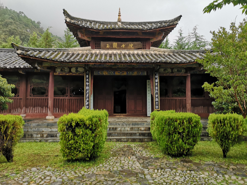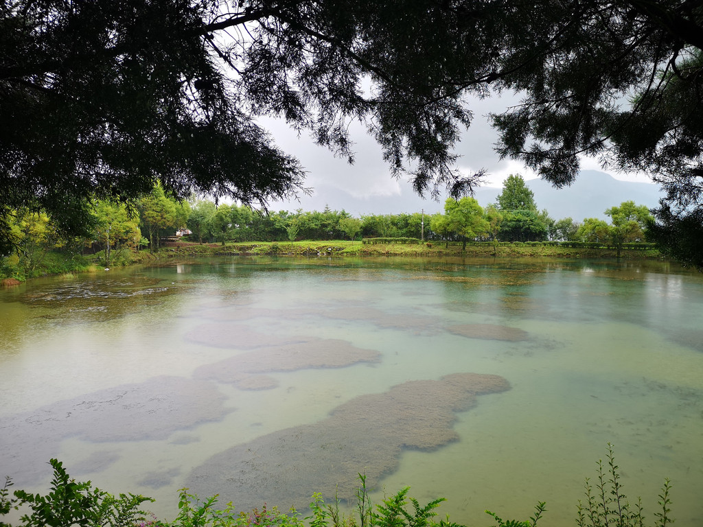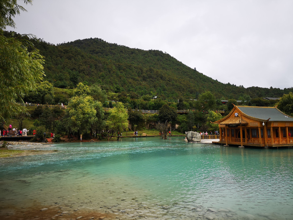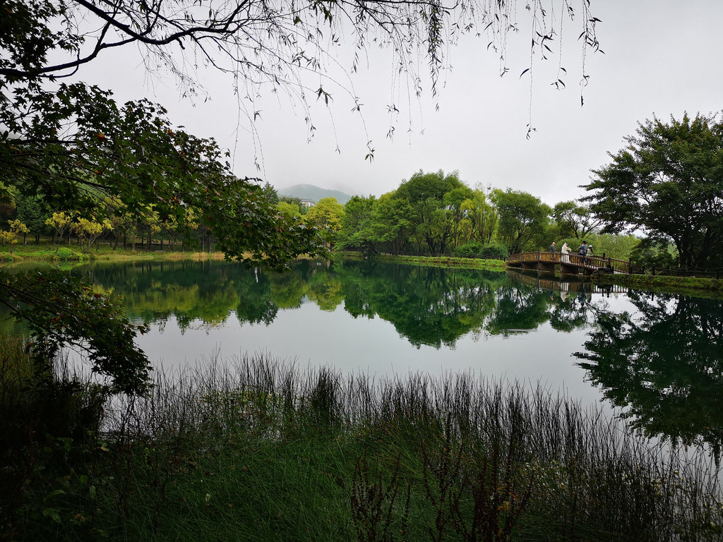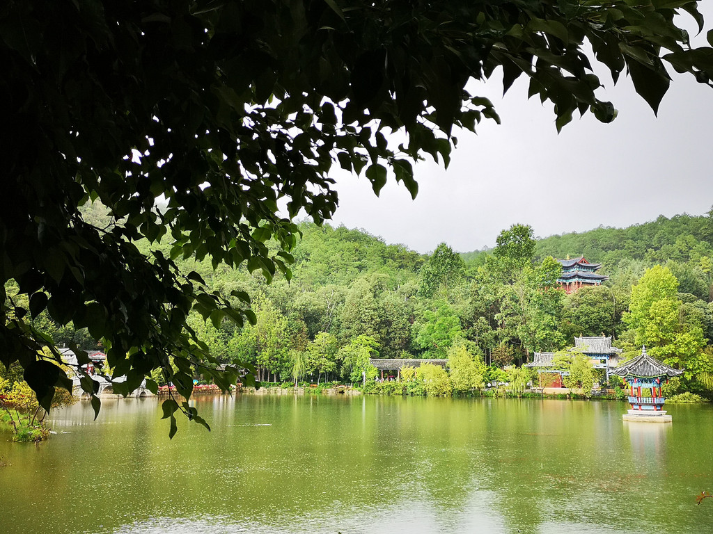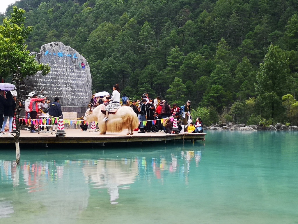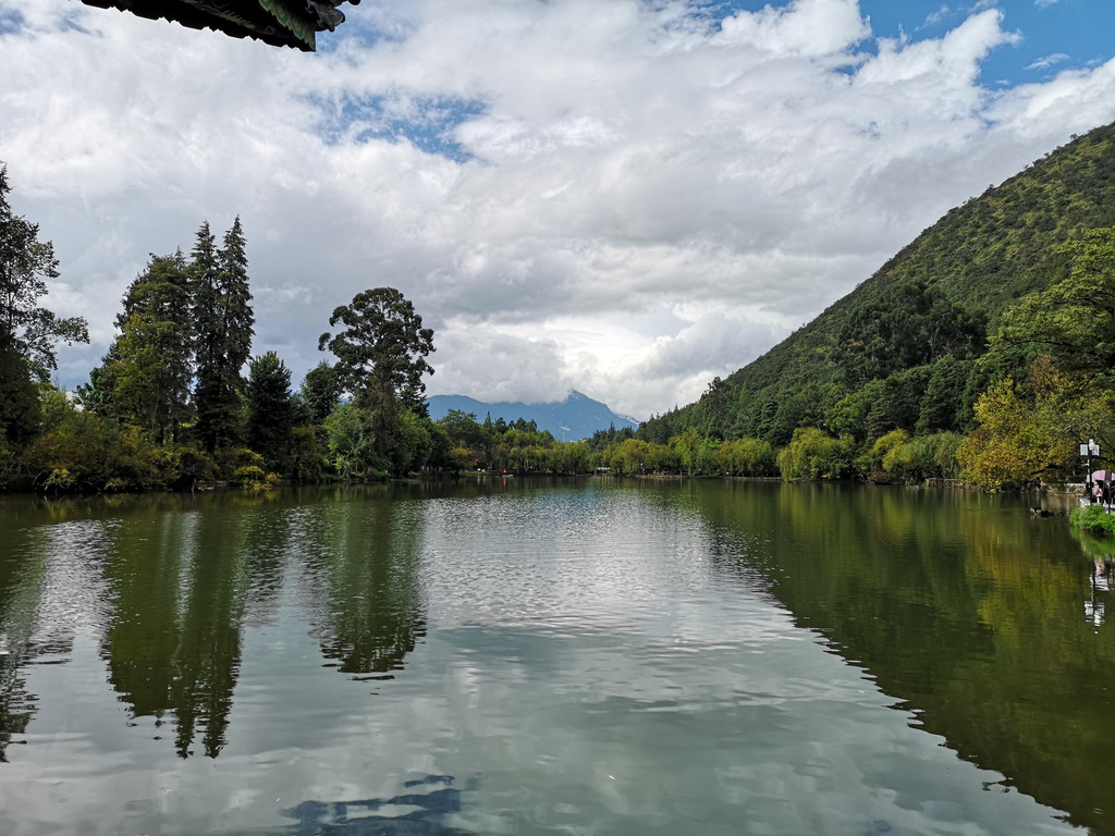 现在玉柱擎天景区主要以介绍东巴文化和纳西族传统民俗为主,景区内有展示东巴文字和纳西民俗的展厅。来这里的人很少,景区内绿树婆娑,玉湖中静置的倒影仿佛一幅油墨重彩的画卷。可惜今天是阴天,我们没能看到玉龙雪山的倒影。