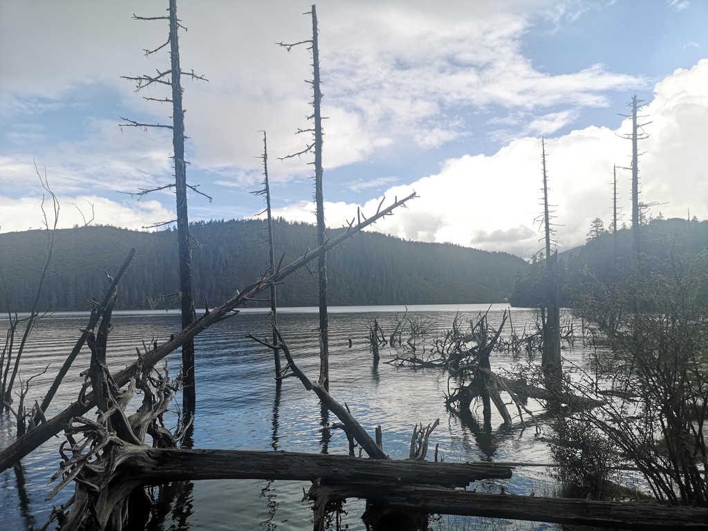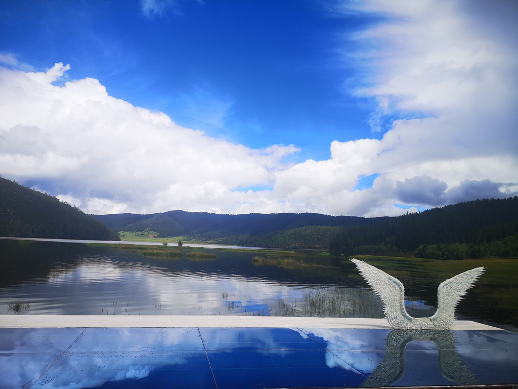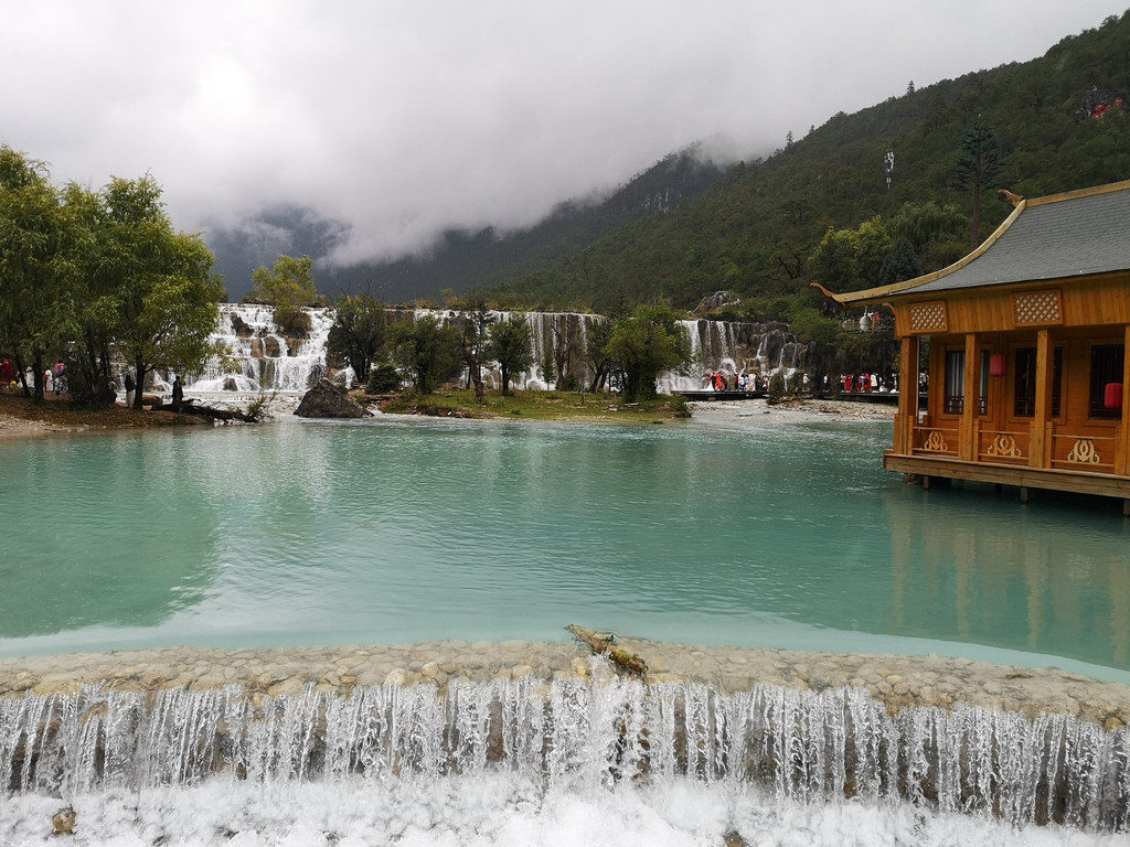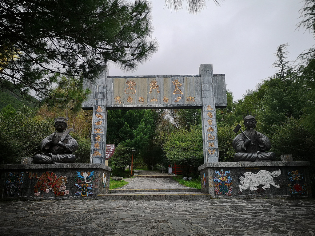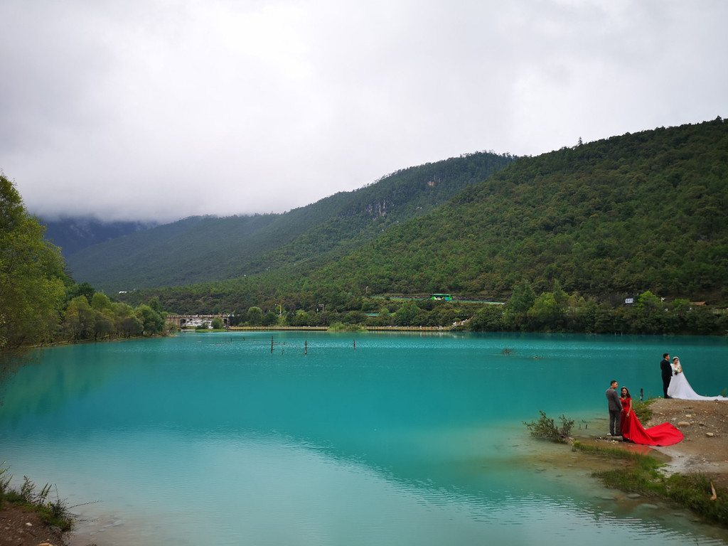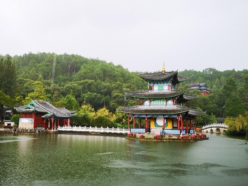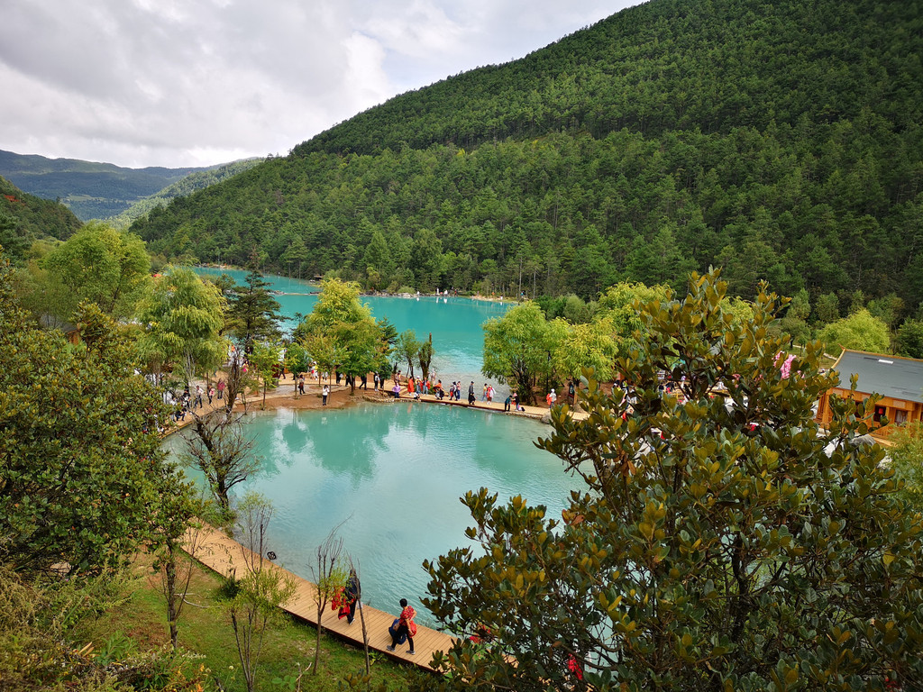 现在玉柱擎天景区主要以介绍东巴文化和纳西族传统民俗为主,景区内有展示东巴文字和纳西民俗的展厅。来这里的人很少,景区内绿树婆娑,玉湖中静置的倒影仿佛一幅油墨重彩的画卷。可惜今天是阴天,我们没能看到玉龙雪山的倒影。