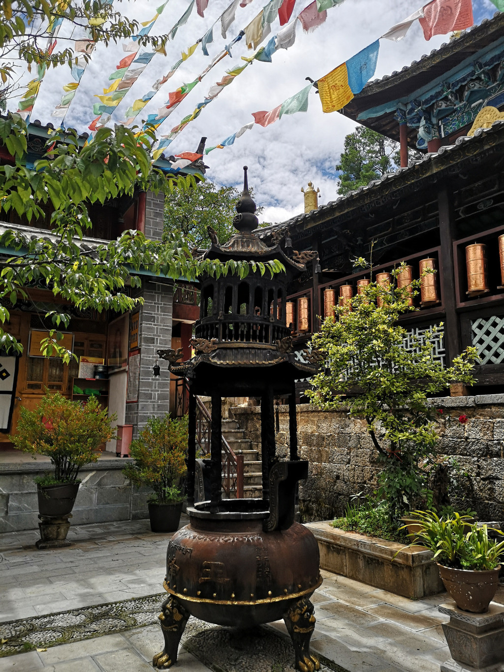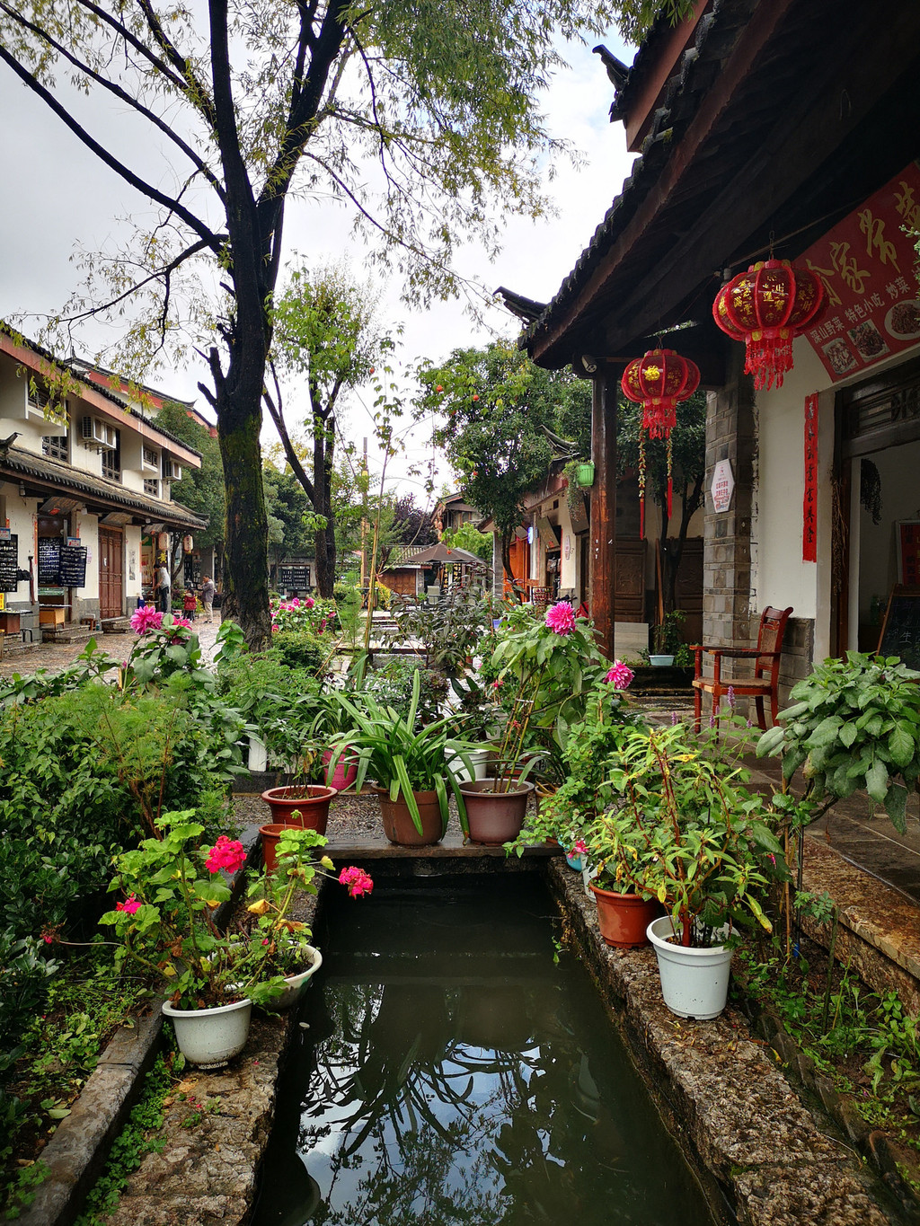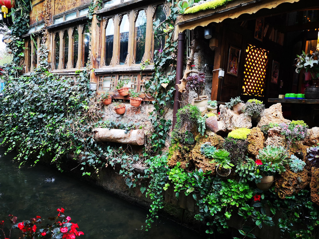 拐入四方街旁的一条小巷,街道两旁到处开满鲜花。沿小巷前行,巷子尽头就是到古城必须打卡的景点--大水车。