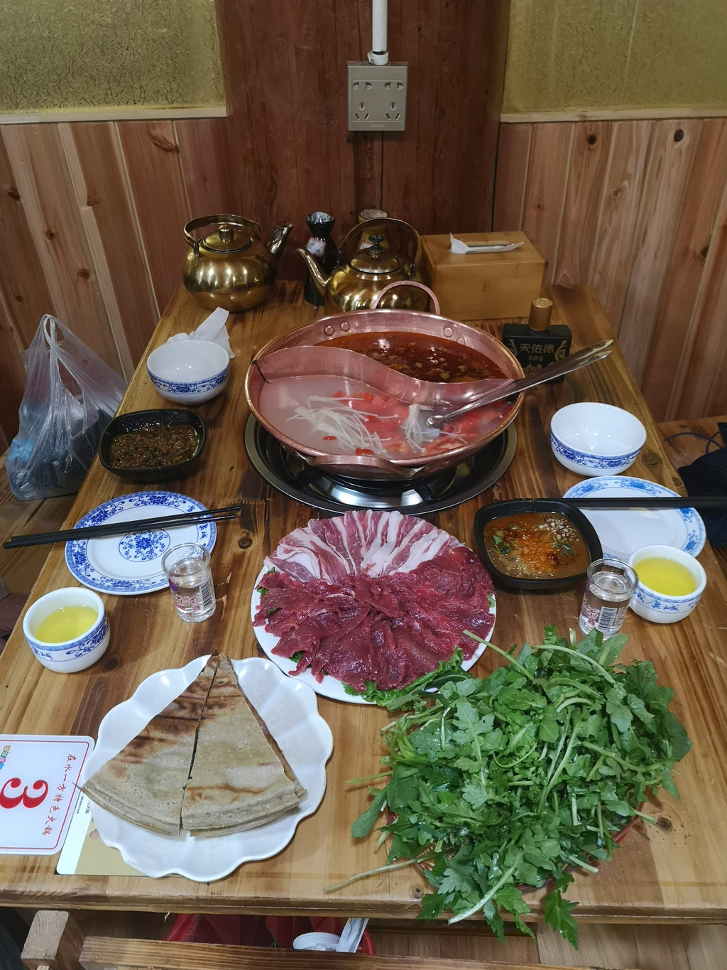 逛完古城,到了晚饭时间,在古城外一家叫阿妈腊排骨的火锅店,点了到丽江一定要吃的腊排骨火锅和水性杨花等配菜。端上来满满一锅都是腊排骨,味道很好,2个人吃饱后还剩下好多没吃完。