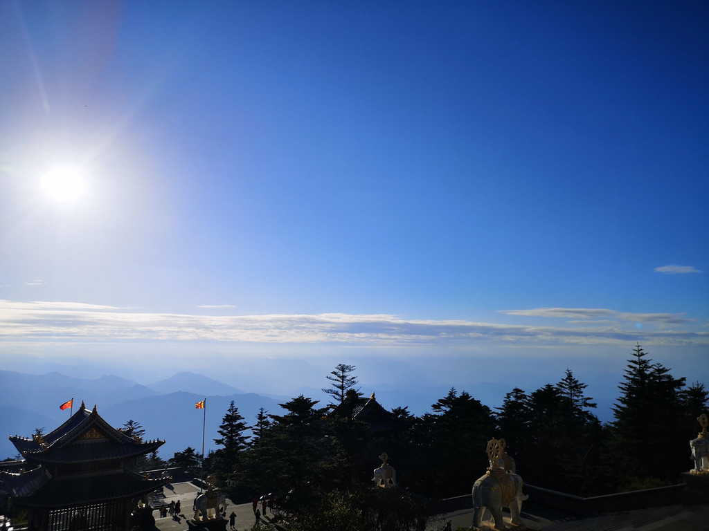 当天边开始出现亮光时,人们开始骚动起来。渐渐地天越来越亮,白云边缘被日光染成金红色,刚开始暗红色的太阳只是在云层边缘露出一丁点儿,慢慢地大半个太阳露了出来。不一会儿,红彤彤的太阳便跃出云层,这时四周的山峦与金顶都被阳光镀上一层金色,四面十方普贤金像与金顶大殿沐浴在霞光中金光闪闪。