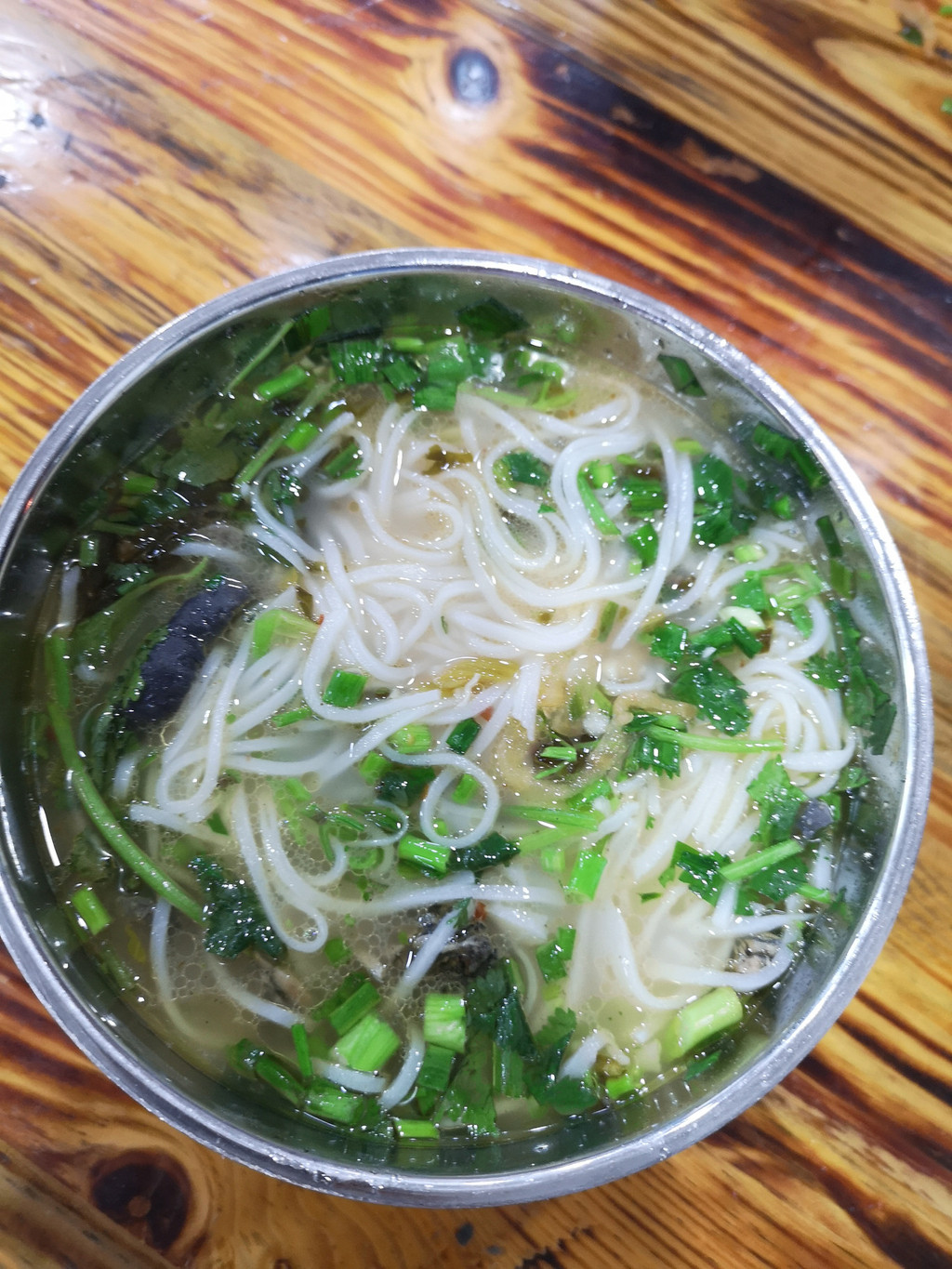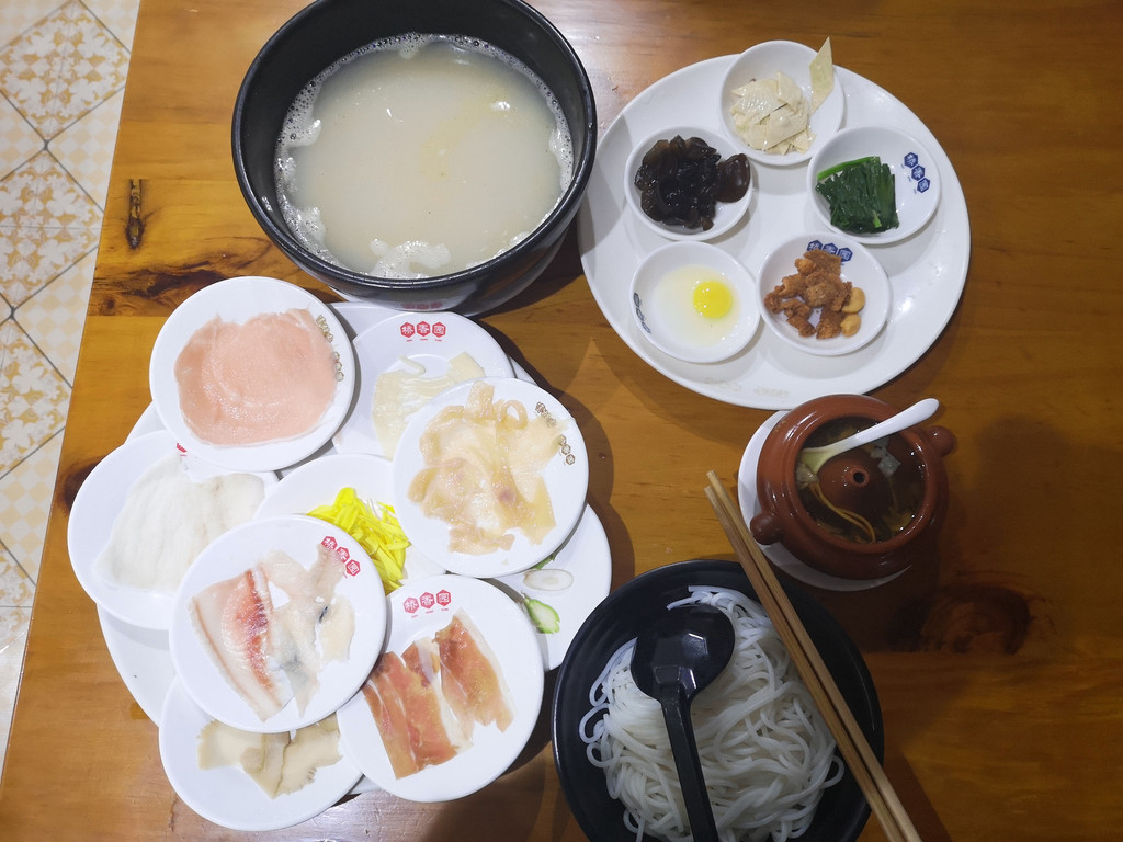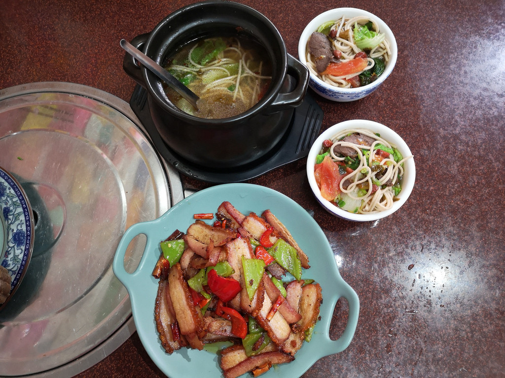 在古镇入口处有家桥香园过桥米线的连锁店,正好可以品尝昆明的过桥米线。除了普通的过桥米线,店里还有秀才、进士、状元等不同规格的套餐。我们点了最具人气的进士过桥米线套餐,除了汤和米线外,还有腊肉、鱼片等许多的配料。趁热将配料放入滚烫的汤中烫熟,然后再倒入米线。沾满鲜香汤汁的米线入口,劲道爽滑,美味可口。