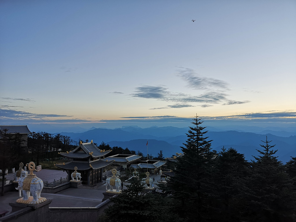 大约5点钟左右,旅游团和住在山下的游客陆续下山了,熙熙攘攘的人群不见了,金顶上只剩下我们这些住在山顶上准备拍落日的游客。我们在金顶上一直等到太阳落山后才回到酒店。