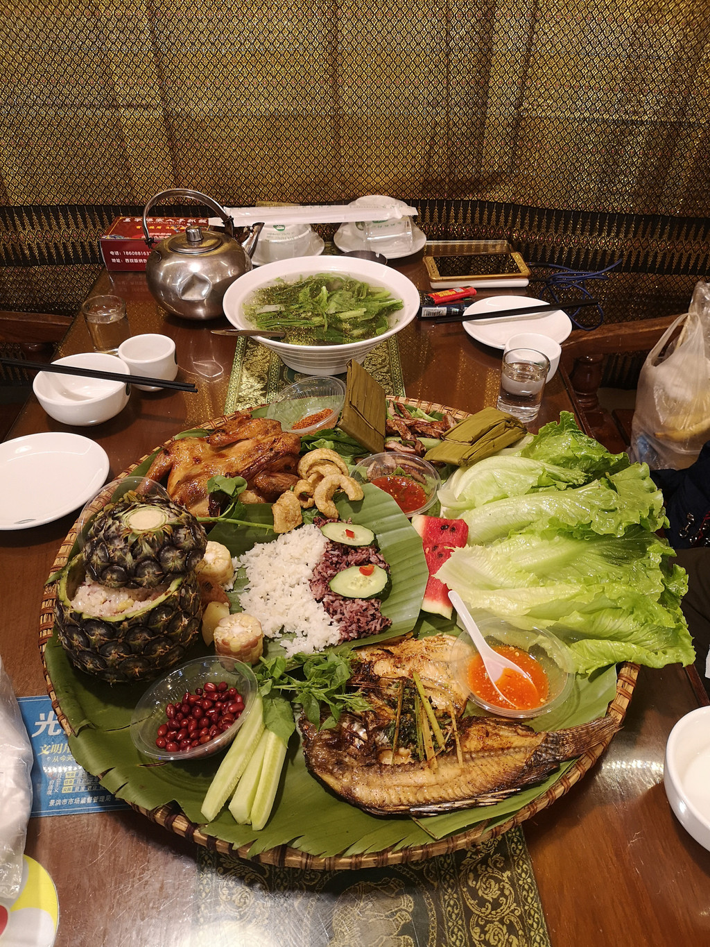 在回酒店的路上意外发现一家叫玉罕傣家人手抓饭的饭店,本来也想尝尝傣家的手抓饭,便决定在这里吃晚饭。点了一份2人的套餐,铺着芭蕉叶的竹簸箕上摆满了各种美食。菠萝饭酸甜可口,杂菜汤清爽中带着丝丝甜味。