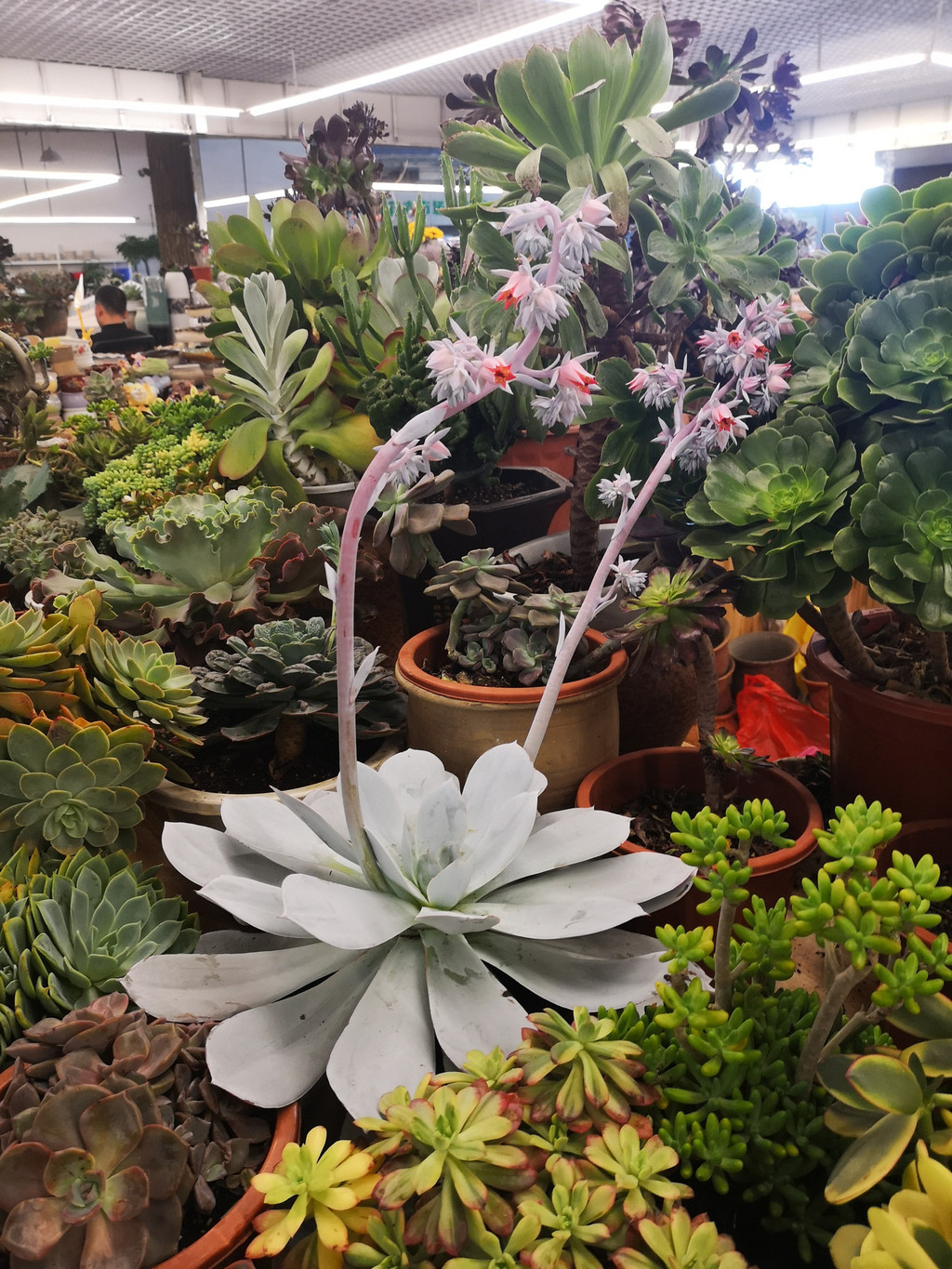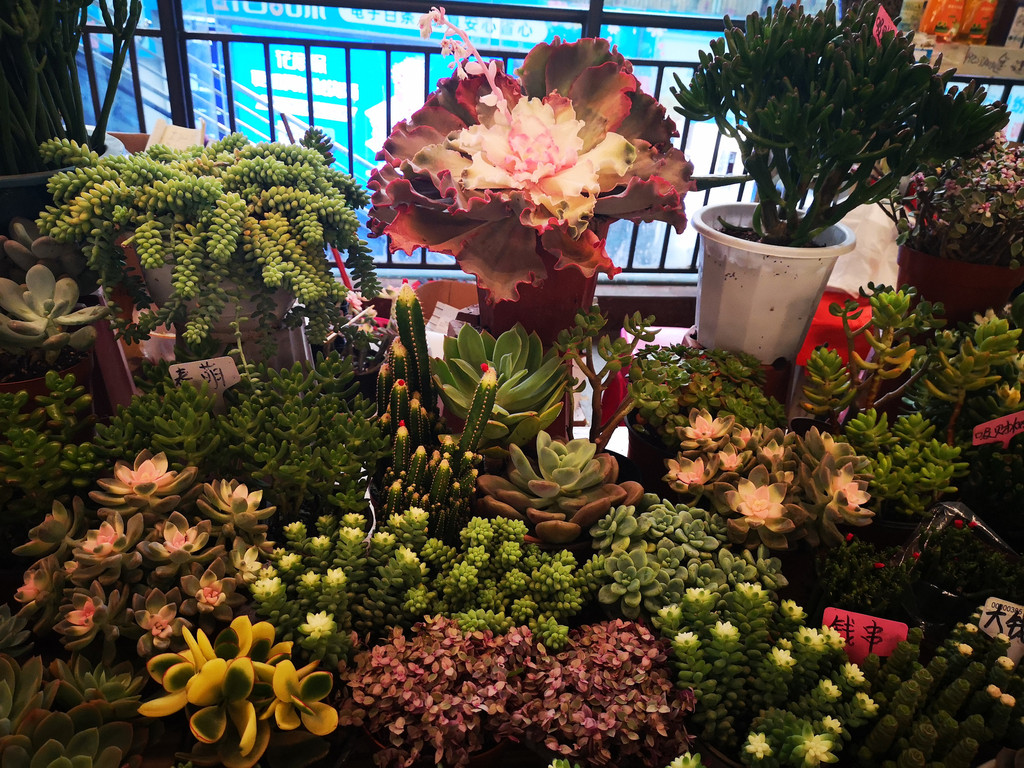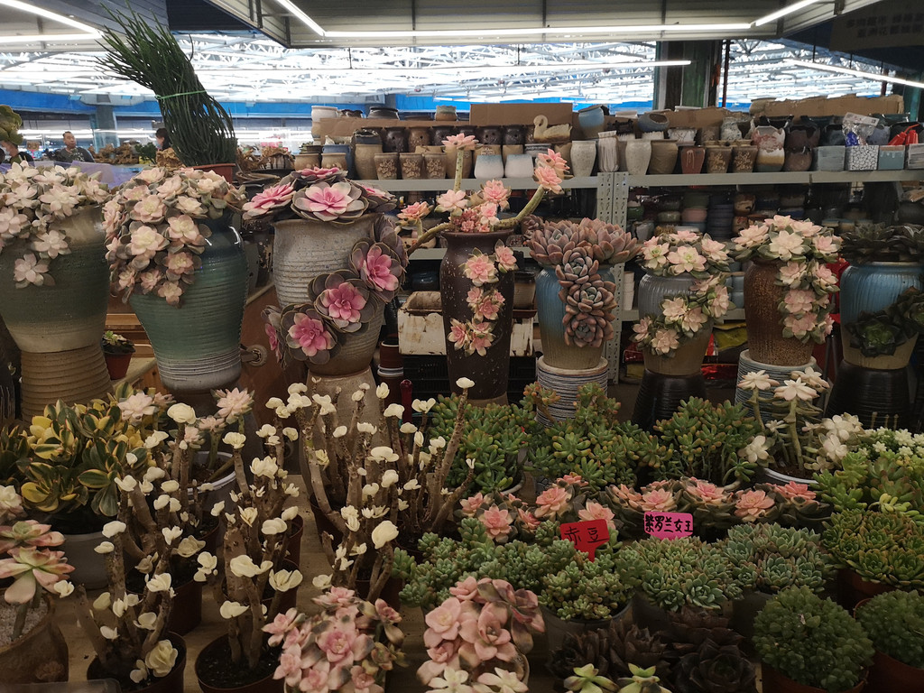 花卉市场很大,一楼主要卖干花和鲜切花,每个摊位上都堆满了鲜花。也许是季节的原因,鲜花的品种不是很多,大多数都是北方常见到的品种,但价格比北方便宜不少。二楼主要卖多肉植物,品种繁多,好多品种在北方很难见到。