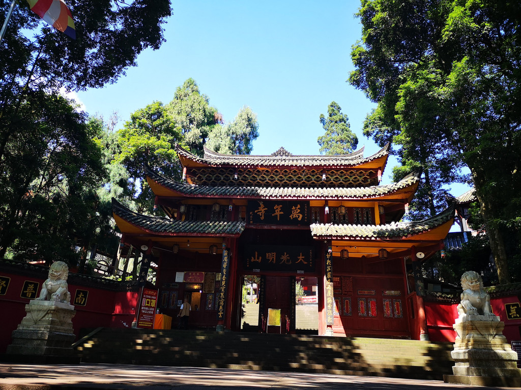 万年寺是峨眉山八大寺庙之一,寺内供万年寺三宝:佛牙、贝叶经和御印。寺中碑刻众多,最著名的为宋代书法家米芾手书的“第一山碑”。寺内的无梁砖殿,为万年寺第二殿,又称普贤殿。建于明代,全以砖块砌就,无一木一柱一瓦,雄伟壮观。