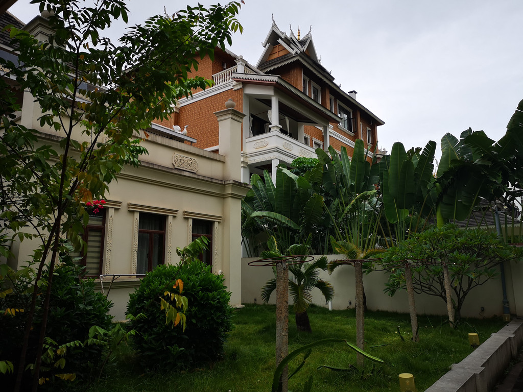 西双版纳是傣族聚集的地方,由于飞机晚点,昨天很晚才抵达位于西双版纳首府景洪的告庄西双景的酒店,没能看看周边的环境。今天早上在房间的阳台上向外望去,只见酒店的花园中和街道两旁开满鲜花,芭蕉树和高大的椰子树上挂满果实。房屋的建筑多为白色,风格与内地迥然不同,极具东南亚风情。
