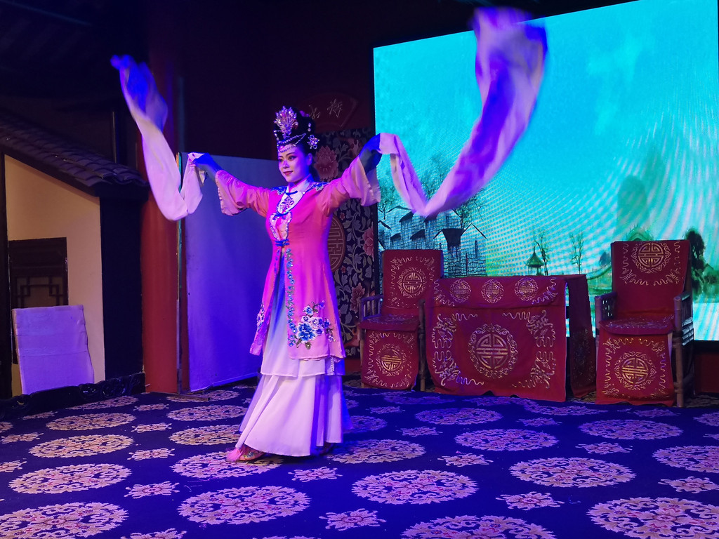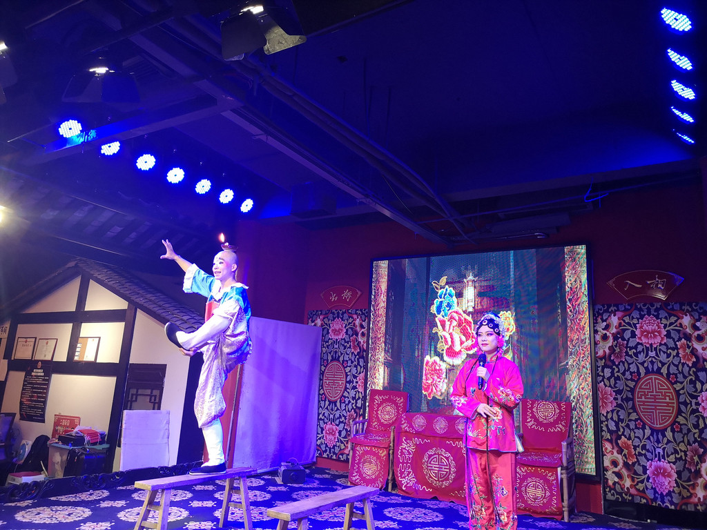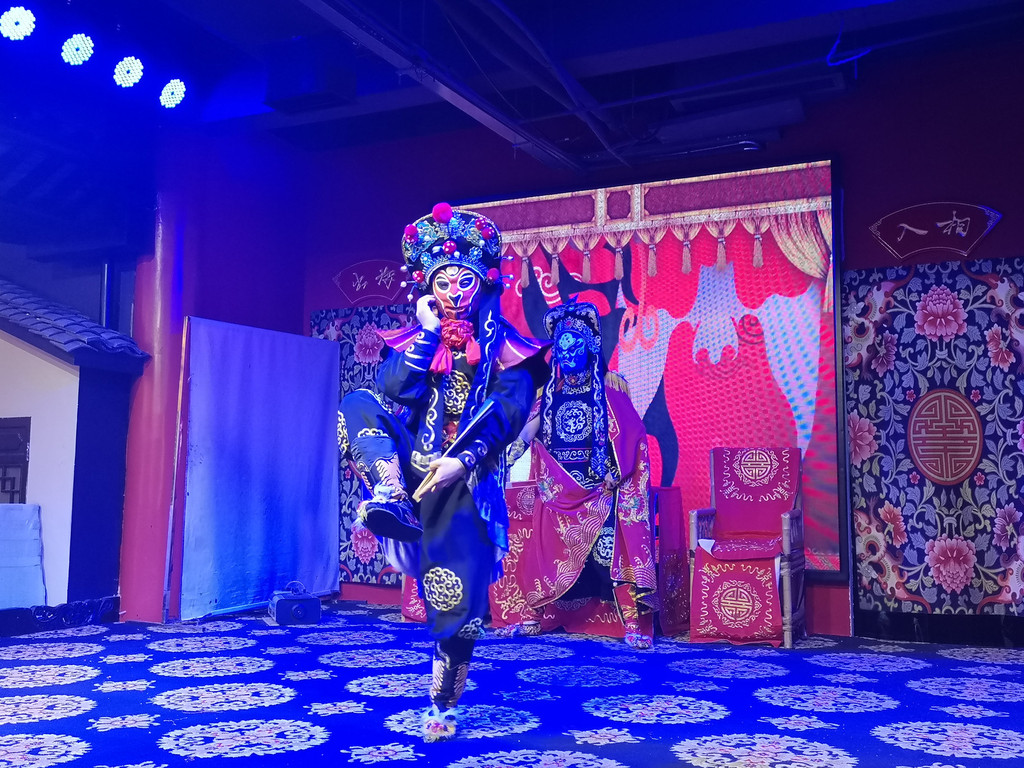 路过三国茶园,正好赶上川剧表演。我们也逛累了,正好进去休息一下。节目内容丰富,有杂技、魔术、水袖表演等,最精彩的当然是川剧绝活--变脸。