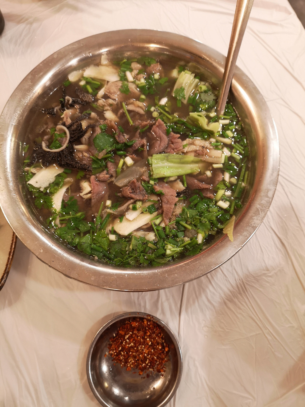 我们点了一个中份的翘脚牛肉,端上来满满一盆,里面有牛肉、牛杂和蔬菜。牛肉和牛杂都很嫩,牛肉汤也很鲜美,用汤汁泡米饭味道更好。