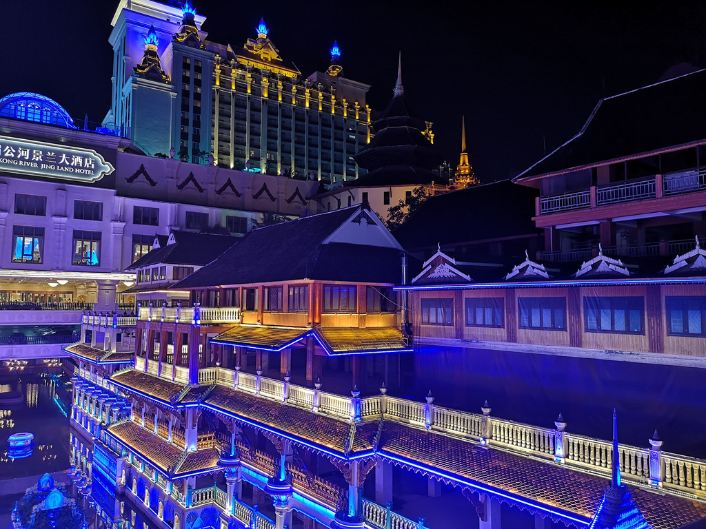 星光夜市在告庄大金塔寺后面的澜沧江岸边,站在大金塔寺的台阶上望下去,摊位一个挨着一个,一大片灯火通明,非常漂亮。