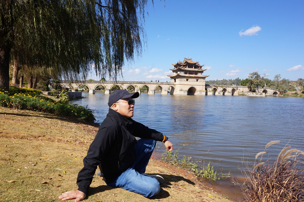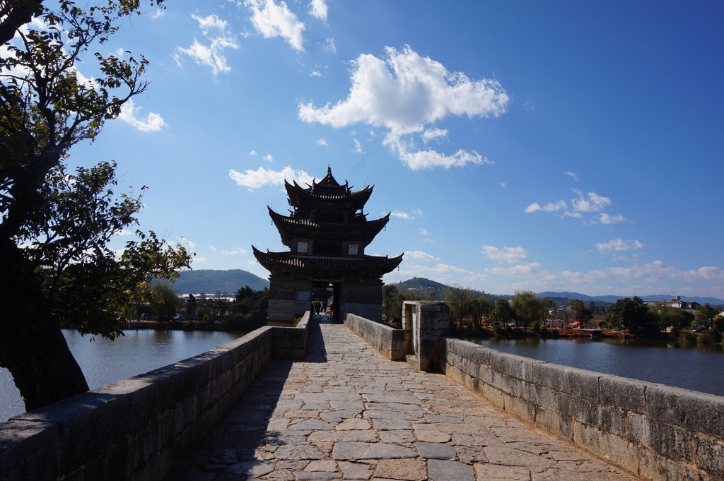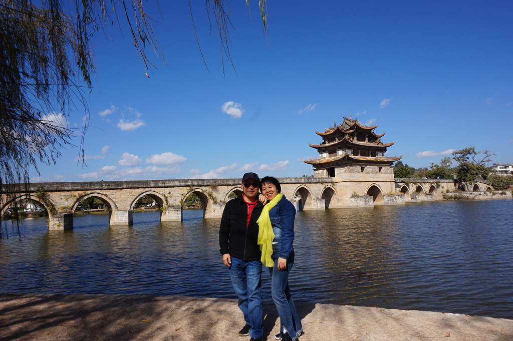 11:00 到达建 水十七孔桥,俗称双龙桥,位于建水古城的西侧,横跨在泸江和踏冲河交汇处。这座古桥建在清朝年间,是云南的一处古迹,古桥一共有17孔相连,桥上还有三层楼阁,古老而又气派,远看像一艘浮在水面上的大船。
