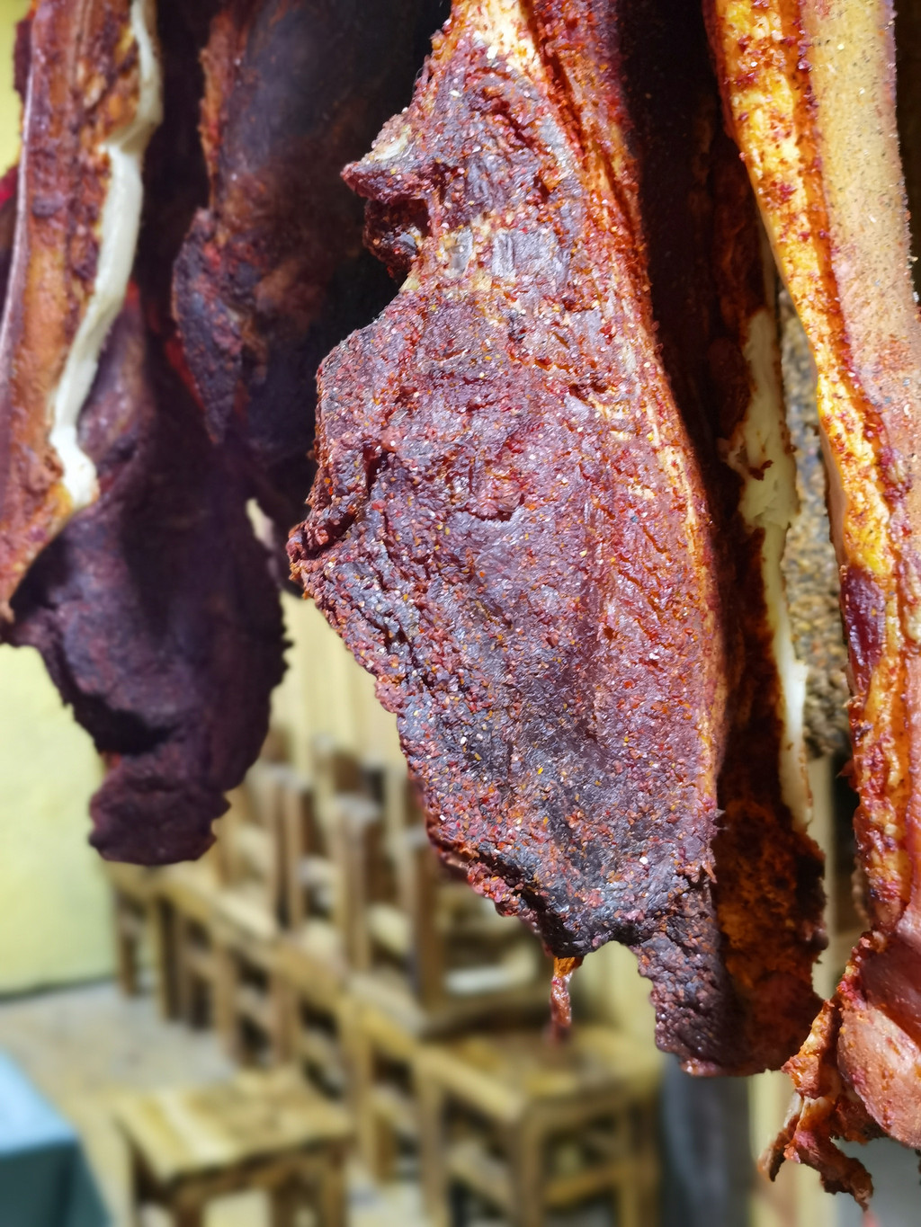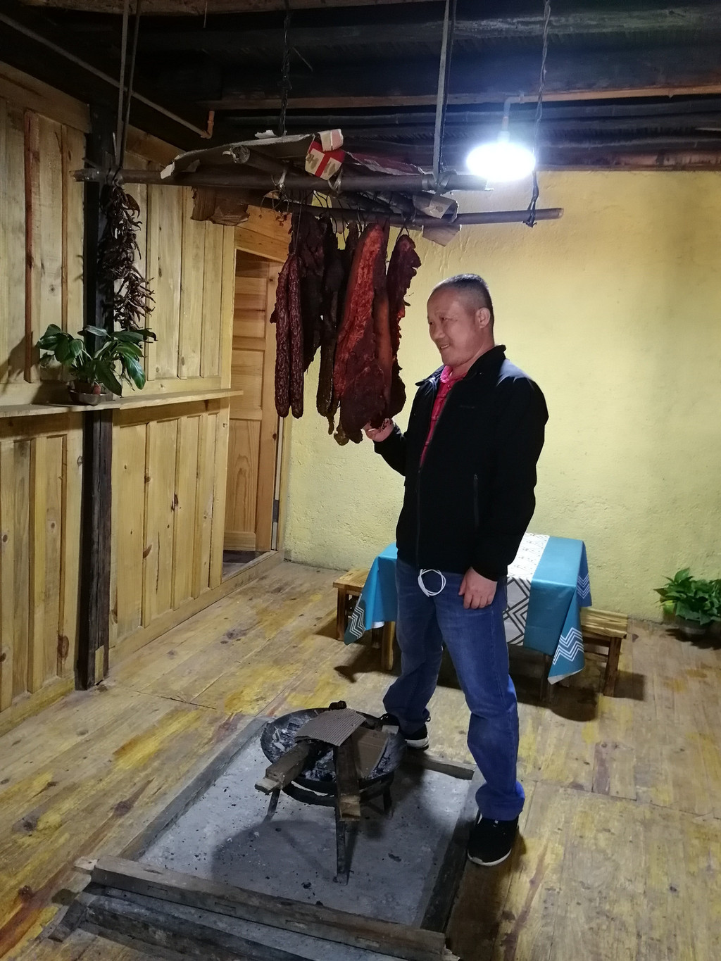 峡谷观景台上来,走进当地人家的民居餐馆,他村民用烟火熏制的腊肉。