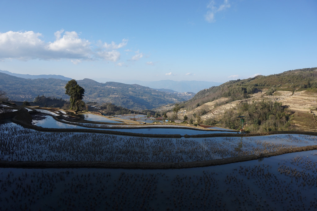 多依树观景台里一直等到8:30分,太阳才完完全全地爬上山头,眼看着梯田的水映衬着天空的蓝色,天光云影共徘徊,水天一色,颇为好看。一直到9点多,待游人全部撤离后我们才回酒店吃早餐。