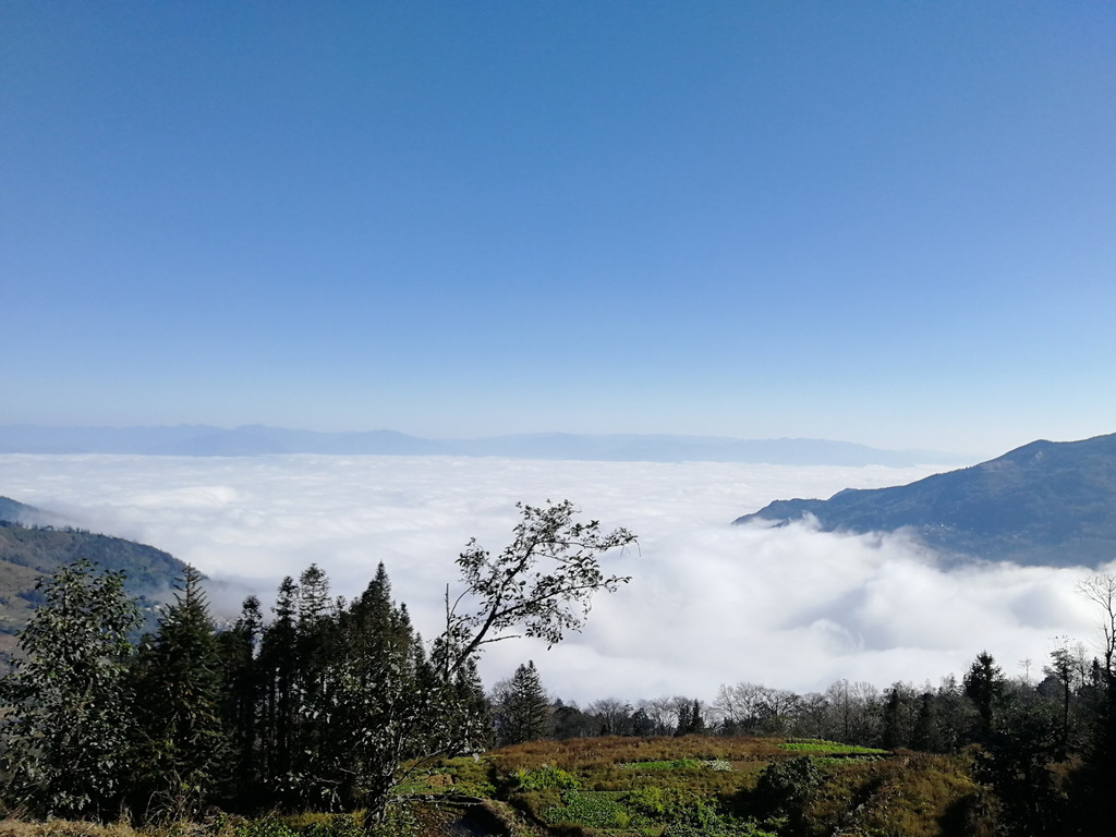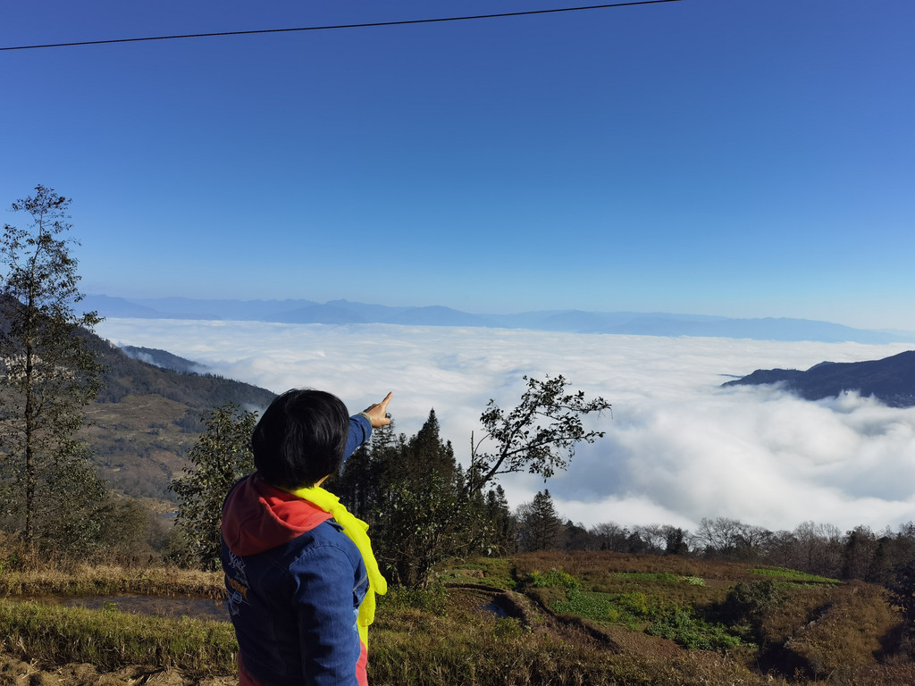 在多依树观景台时就看到峡谷上方布满了云海,一直在心心念念之中,吃完早餐,问明老板看云海的最佳地点,马上开车往黄草岭方向赶去。