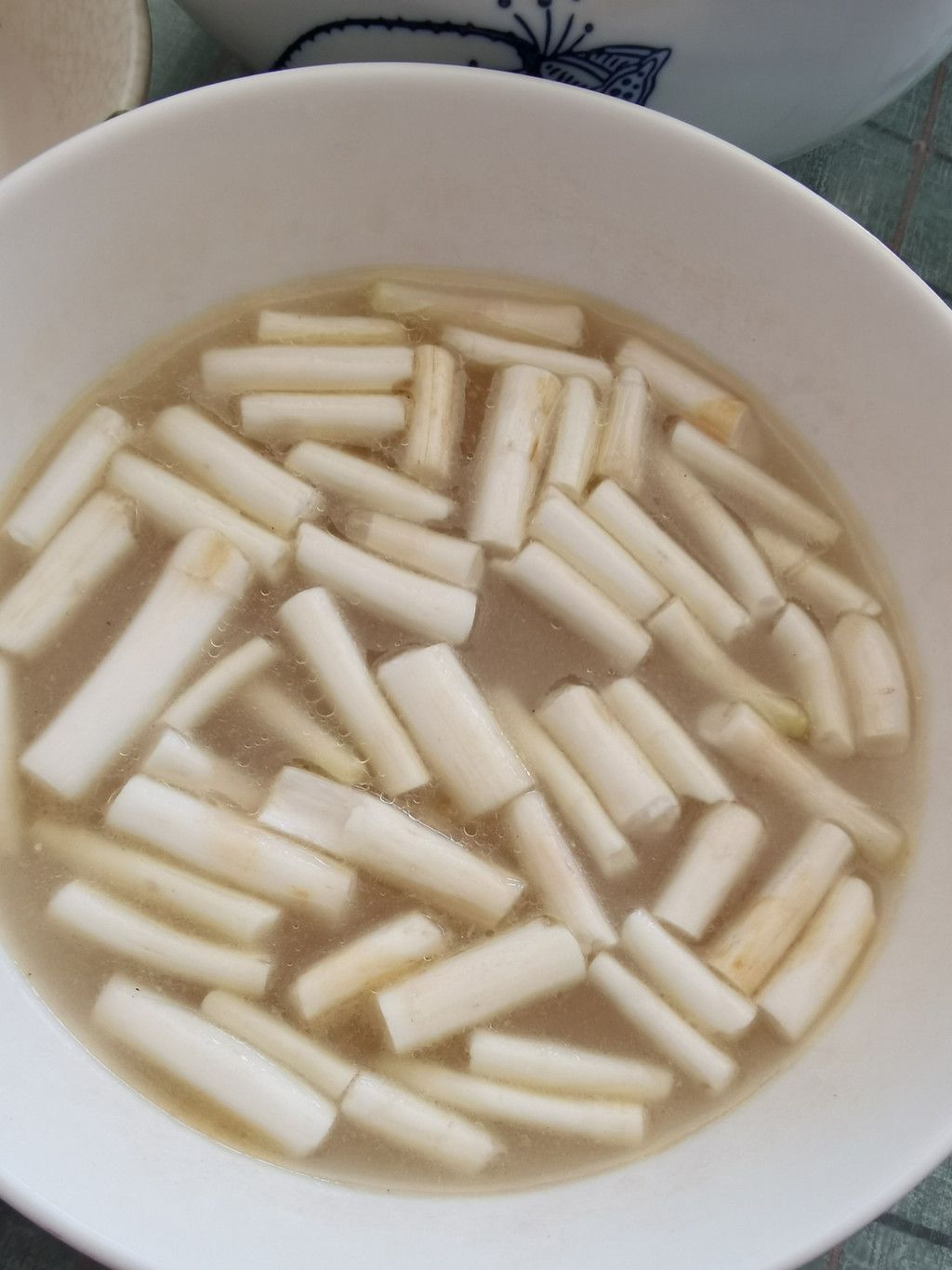 双龙桥出来转入大道口,选了一家比较明亮的餐馆,在与老板一阵交谈之后,告诉我们来了建水一定要吃当地最出名的草芽,草芽是一种种在水塘泥潭里的植物,类似于莲藕,在草芽刚冒出泥潭表面的时候就要采摘回来,否则就会变老,没有这么鲜甜。我们按老板的推荐,点了两份草芽米线,的确是非常的清甜,嫌吃得不够过瘾,直接就要老板在上来二十元钱的草芽,吃过够瘾。