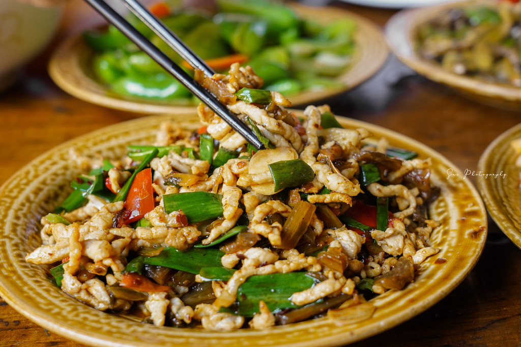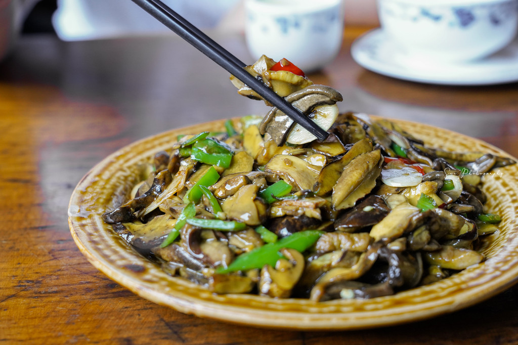 一家平凡的家庭餐馆,开放式的客厅和两层的小楼,店家在自家的院子支起餐桌,便是当地人习以为常的下饭去处。手写在小黑板上的家常菜单,一旁的冷柜摆放十几种叫不出名字的菌类,朴实的老板娘在厨房里忙活着,招呼老板来给我们点菜,两个人点了四道菜,吃得特别满足。
