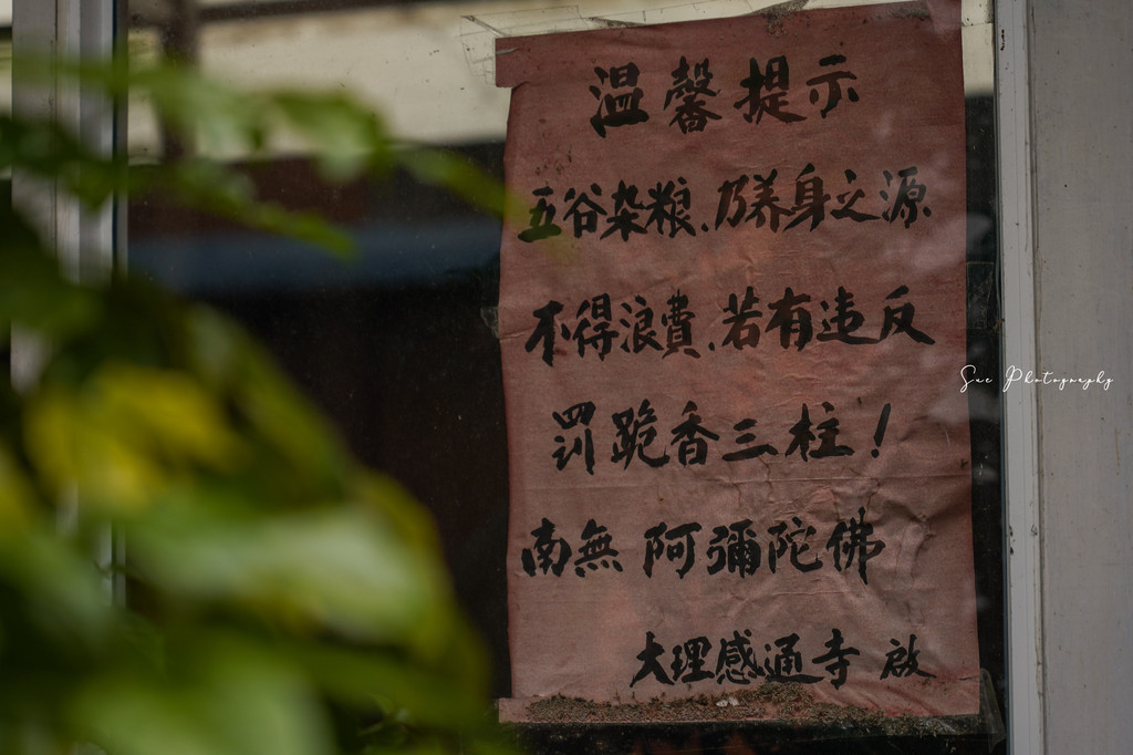 虽然菜品没有剩多少了,也有我喜欢的炒豆腐,炒包菜,土豆片,手捧到一碗热饭的瞬间是感激零涕,默默地不剩一粒米饭的吃完了,吃完抬头看到贴在斋房的字,心想“善哉,阿弥陀佛”,还好遇上了感通寺,这趟斋饭之旅完美地弥补了在寂照庵不好的心情。