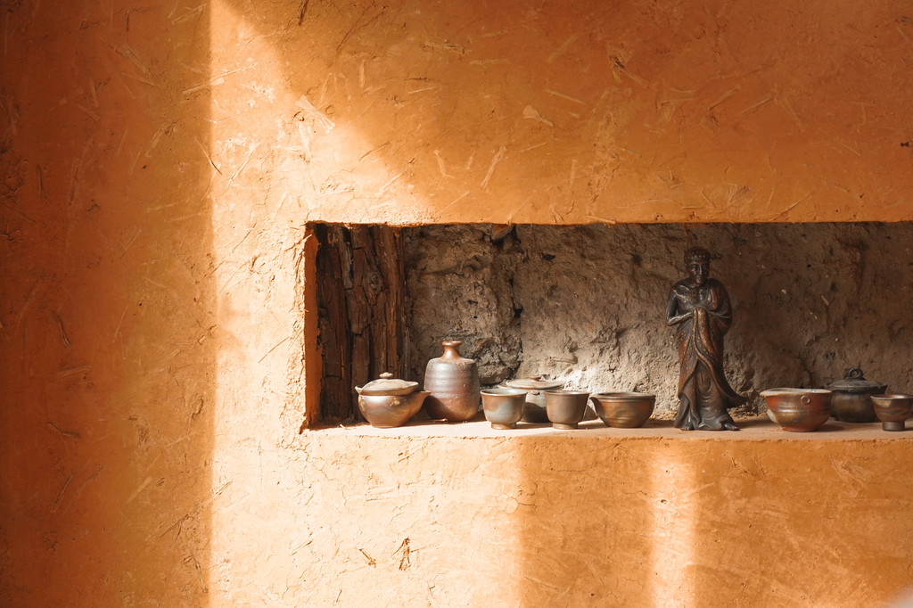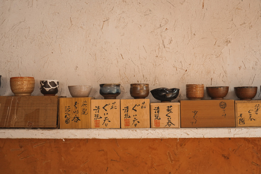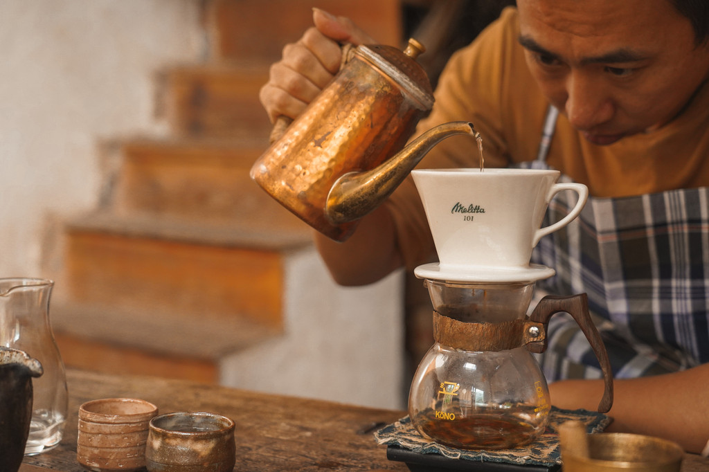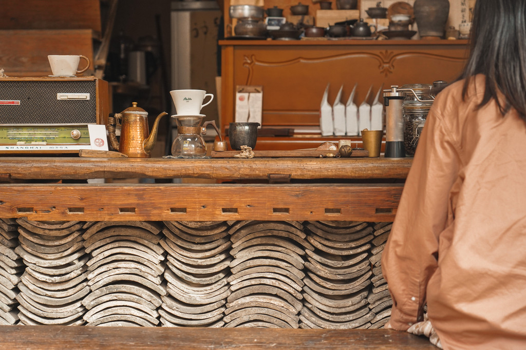 青瓦片砌起,老式木板已被磨得光滑的台面上,简单的咖啡器具,Kinu手磨,Kalita的铜壶和滤杯,就组成了吧台。墙面上的日式手工陶杯一字陈列,看得出来主理人对器皿的独特爱好。