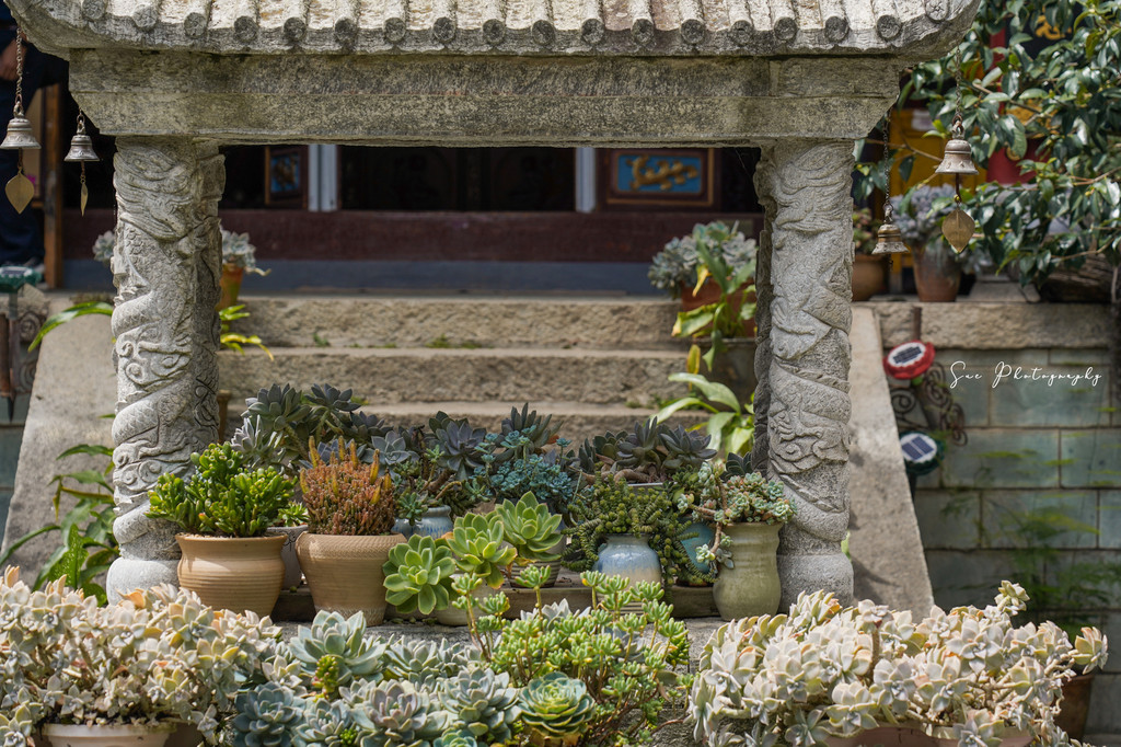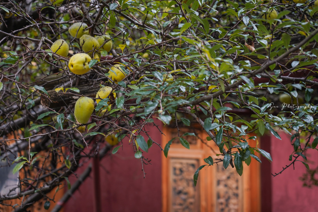 感通寺内慢慢欣赏,其实别有一番美感,他不是精心布置过的美,而是有点沧桑、有点破旧、但充满生活感的美。 梨树 和柿子树结满了果实,瓦片上悬挂着落灰的蜘蛛网,地上也堆满了多肉植物。