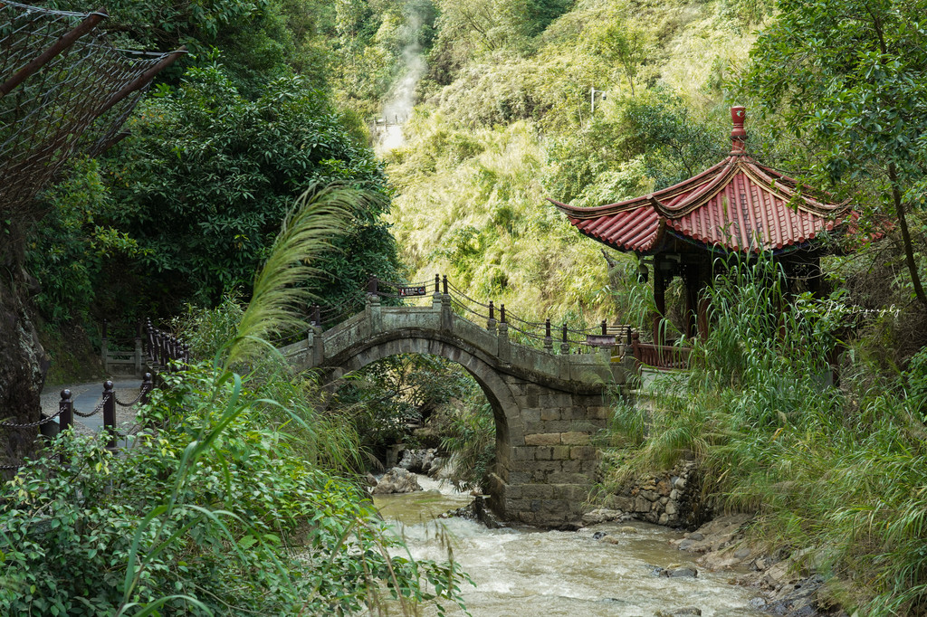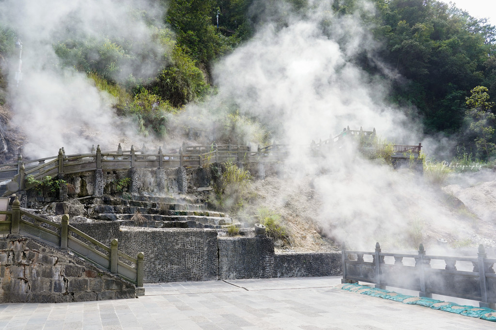 一条四季温热的溪流穿过整片壑谷,形成了大大小小的泉眼和池子,从售票处坐接驳车再深入山谷中,只看见白烟缕缕从山中升起,是有几分仙气。