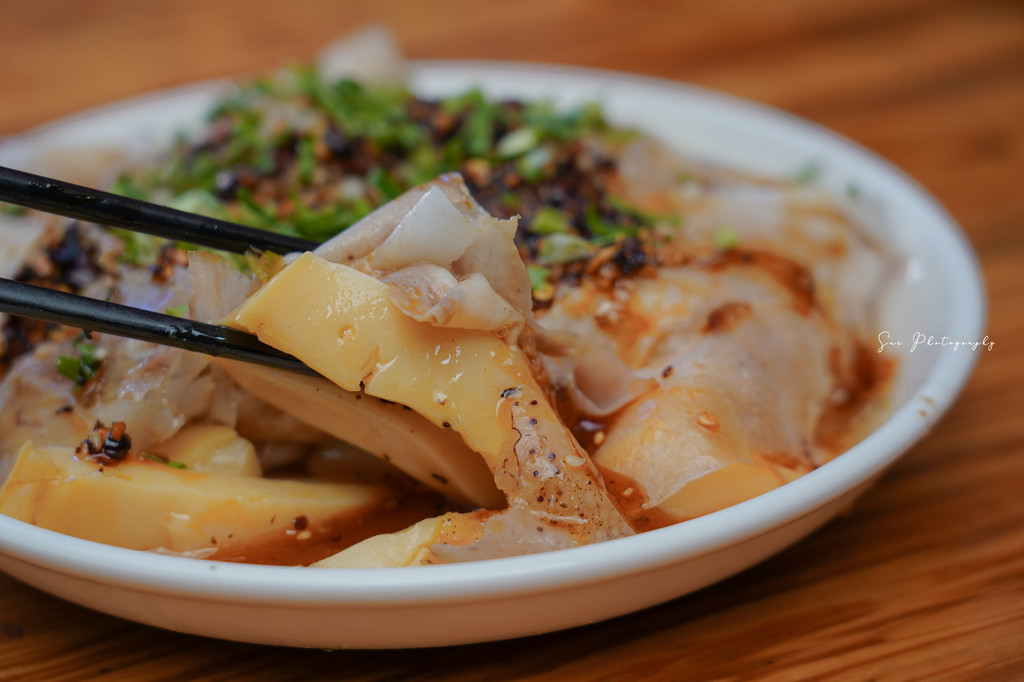 大薄片是切得薄如蝉翼的猪肉片,轻弹爽口,加上辣椒粉的调味,搭配着果冻一样的豆粉一口吸入,是想一口接着一口吃的味道呀。