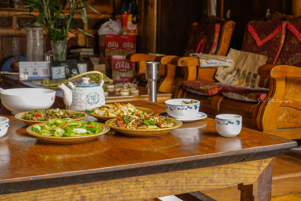 花姐是地道的和顺人,餐厅就在自家近300年的老宅里,典型的四合院结构,入门两侧摆满了酒坛子,老宅里的石板、木质家具都充满了年代感。
