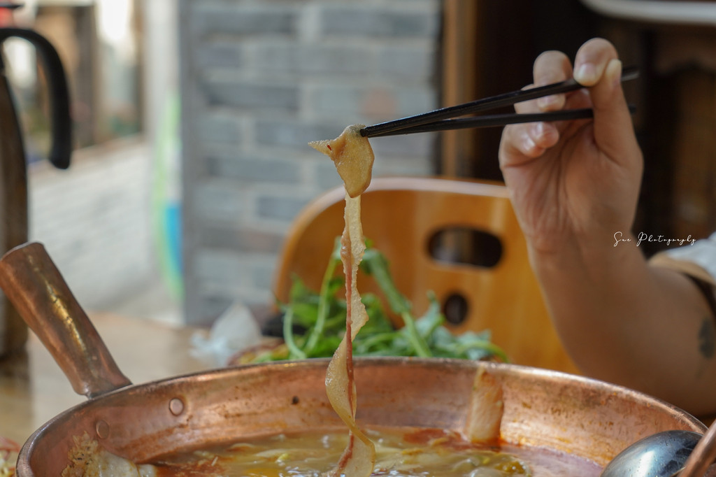 和顺古镇内,民宿小姐姐推荐的一家牛肉火锅,一锅大铜瓢里是煮得浓厚的牛骨汤,里面放了满满的牛杂、牛肉、牛皮,不记得点了几斤的,只记得铜瓢里总能源源不断地夹出来牛肉,牛肉和牛杂特别有味道,它不像潮汕牛肉火锅那样涮得入口即化的口感,相比下来有些韧性,却入味十足。