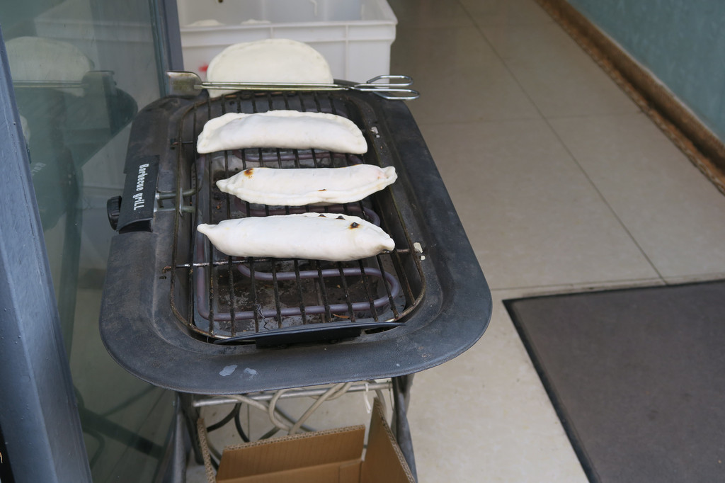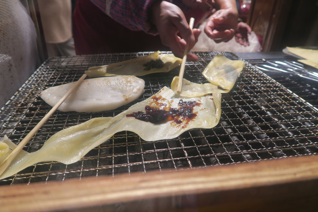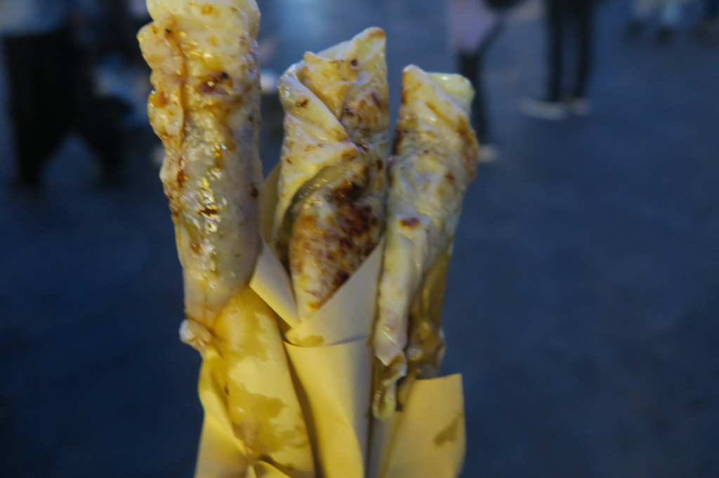 首先看到的是这个饵块就是年糕的另一种形状,有甜、咸两种口味,里面包上酱料,花生碎什么的,再加油条包起来烤。