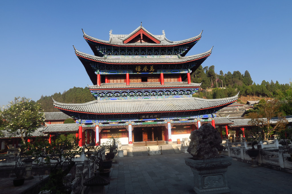 从这上去一点,就是万古楼了。万古楼位于丽江古城西侧的狮子山顶,是古代木氏土司家族的庄园建筑,楼阁雕饰景致,外观又十分大气。万古楼本身也是一座值得参观的建筑,这座阁楼共有13个翘角,象征着玉龙十三峰;雕饰中有披星戴月等2300个吉祥图案,全都十分精美,而且还代表着丽江居住的23个民族;另外还有龙纹、藻井、石刻等,各具特色,参观时不要错过。