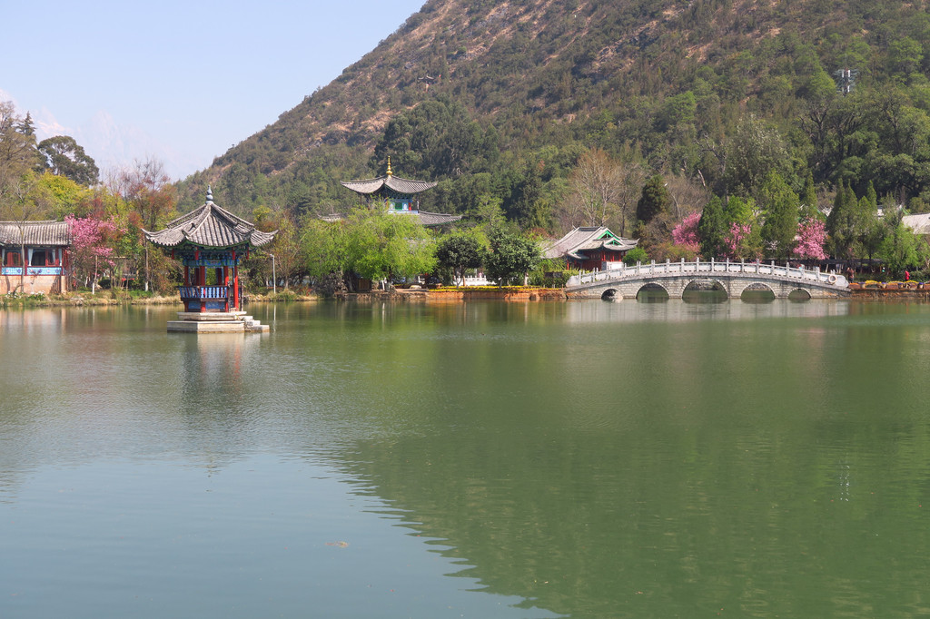 黑龙潭原是丽江的一个龙王庙,庙旁泉眼众多,积水成潭。因为泉水如玉,能倒映玉龙雪山,也称“玉泉公园”。这里是丽江古城的水源地,在泉潭边便可以看到涌出水面的泉柱,泉水十分清澈。