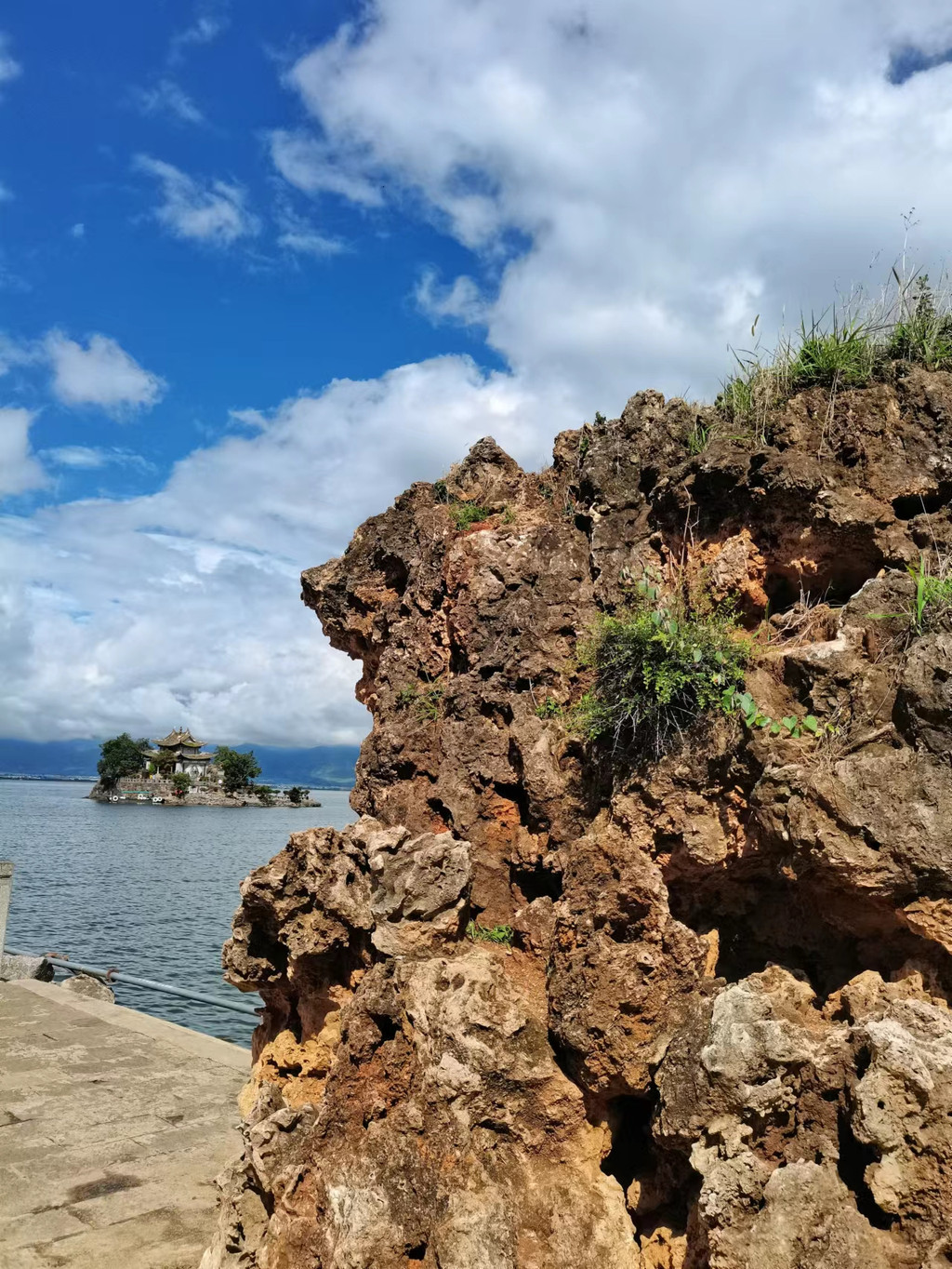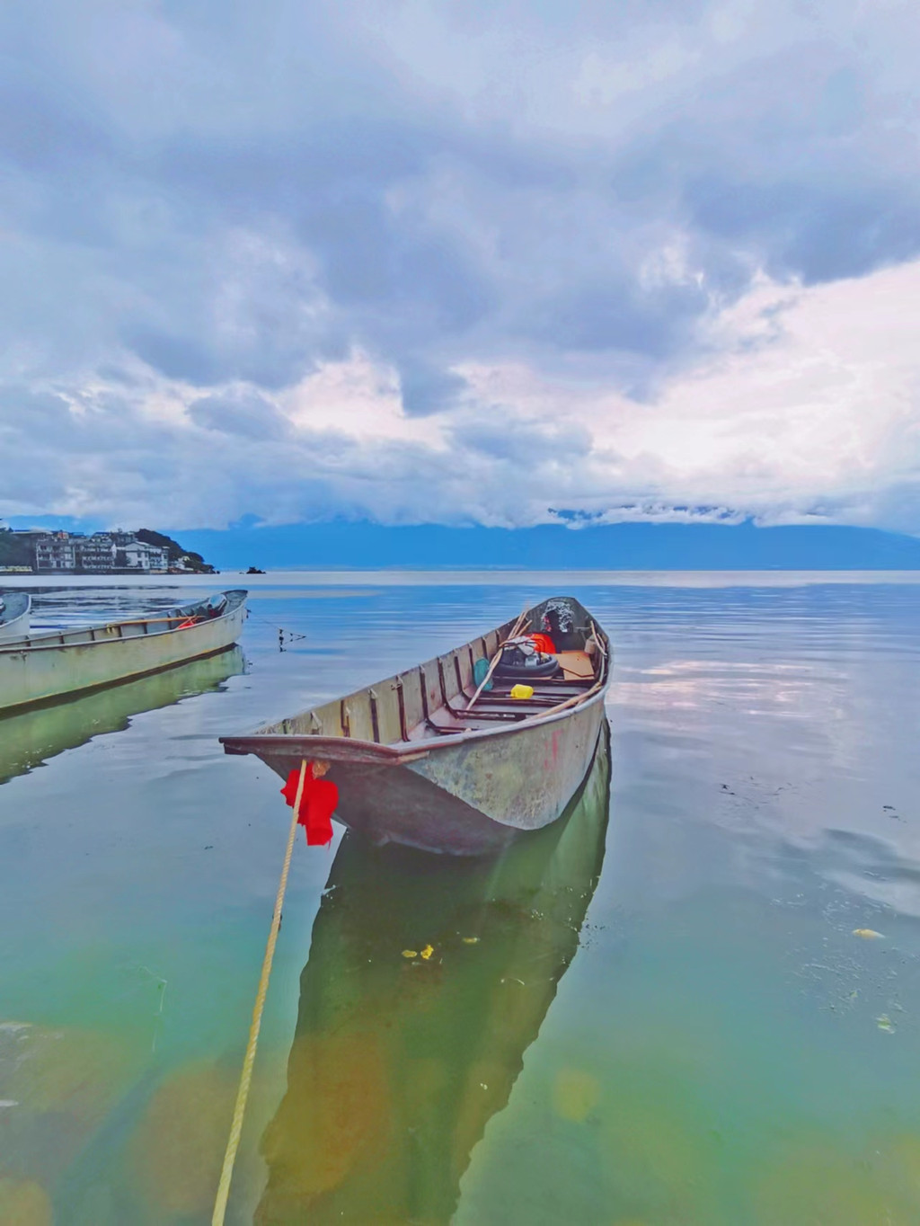 今天一大早出来太阳就高高挂起,清风吹开迷雾,小船在波光粼粼的湖面缓缓划过小普陀,苍山雪山在云海的笼罩下若隐若现,蓝天白云美不胜。