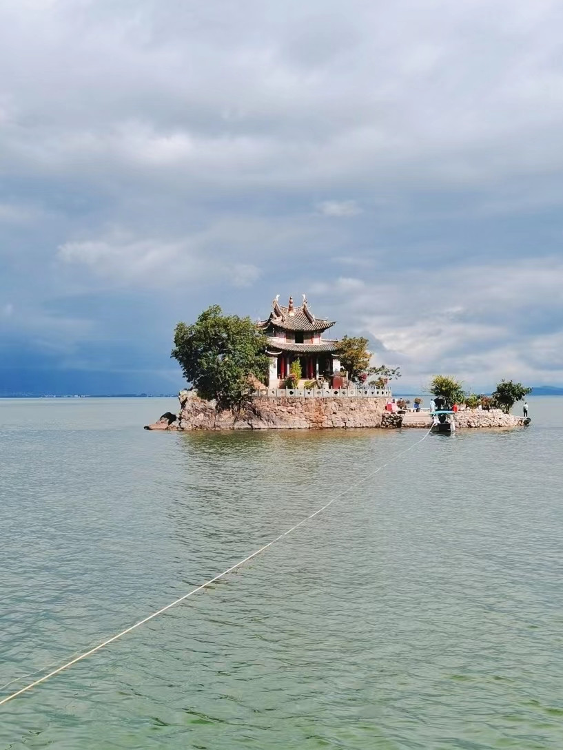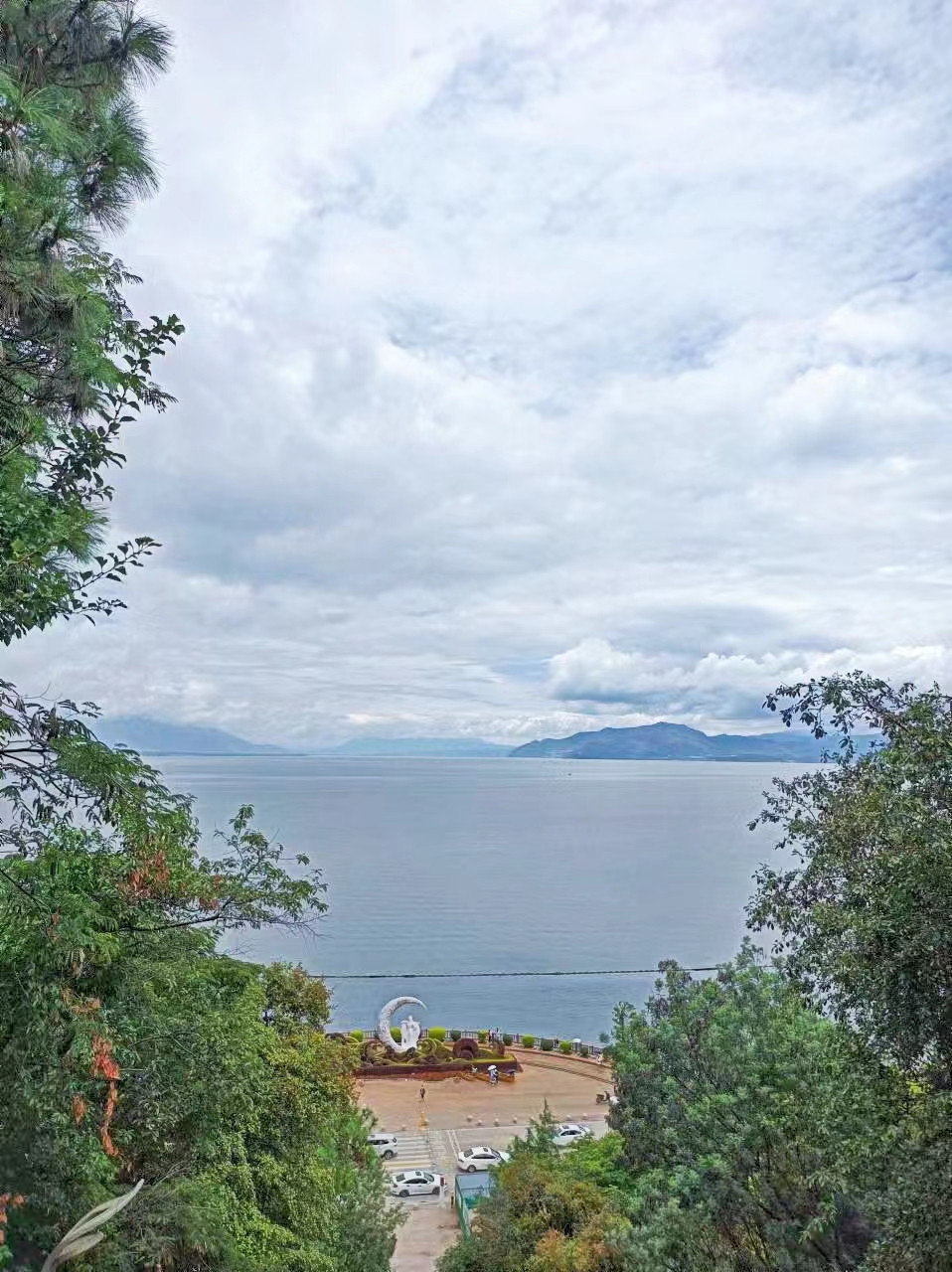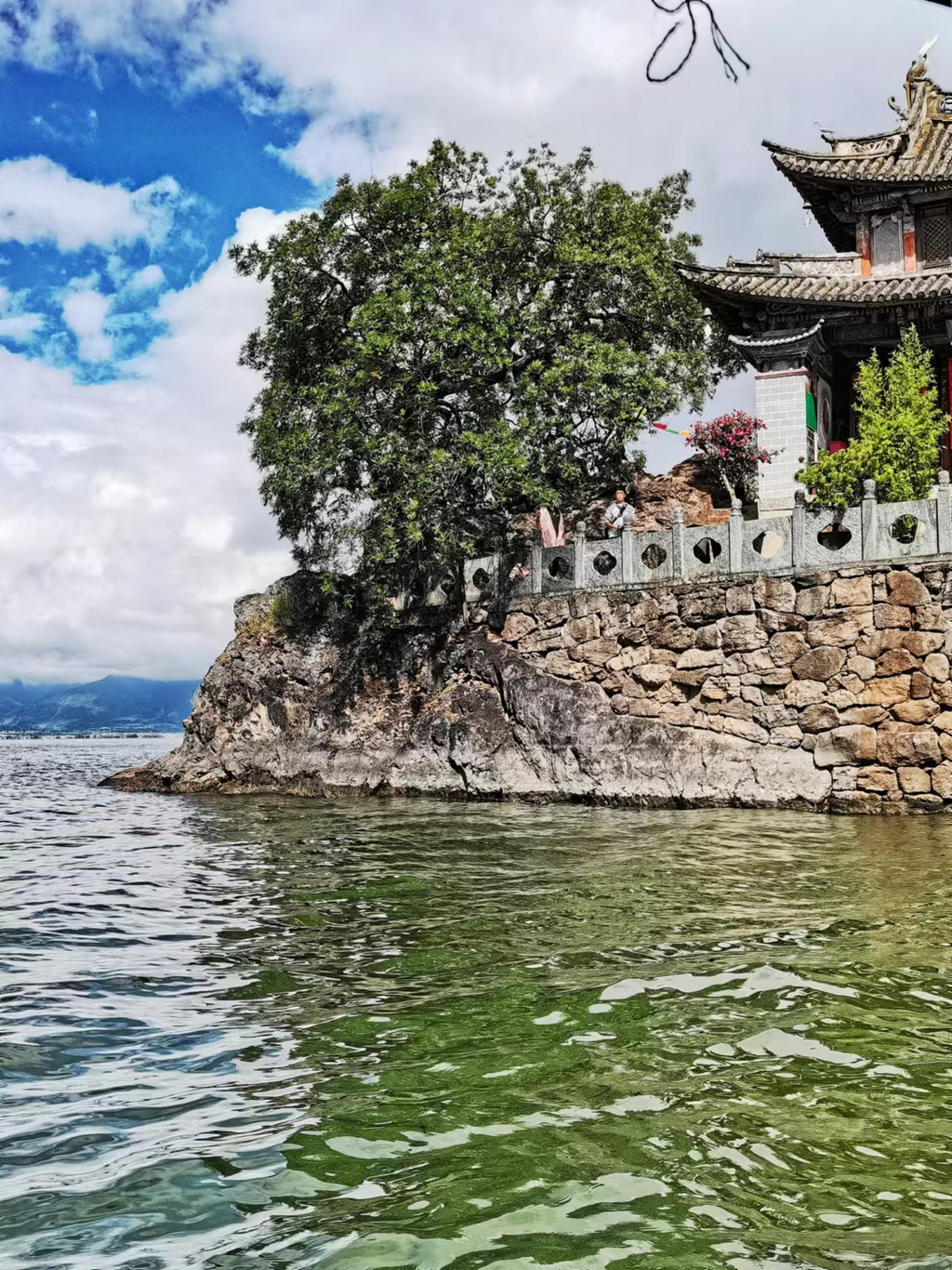 经过了小普陀,很远就看见了看了,洱海上的普陀寺,刚好门口有一个车位。
