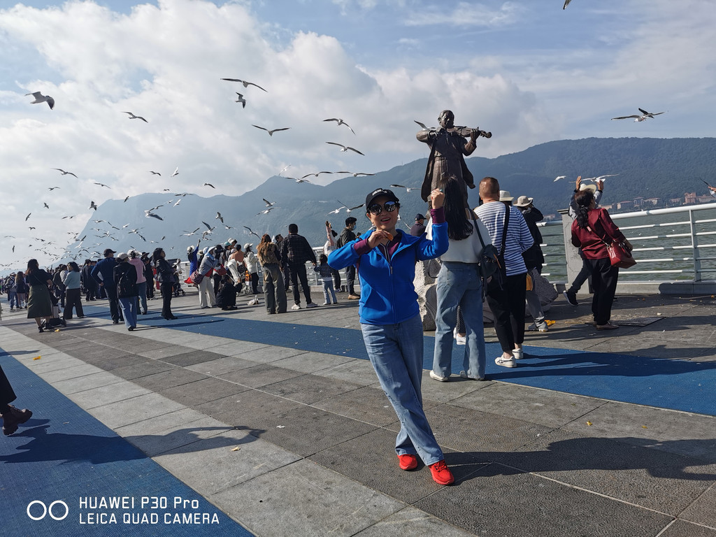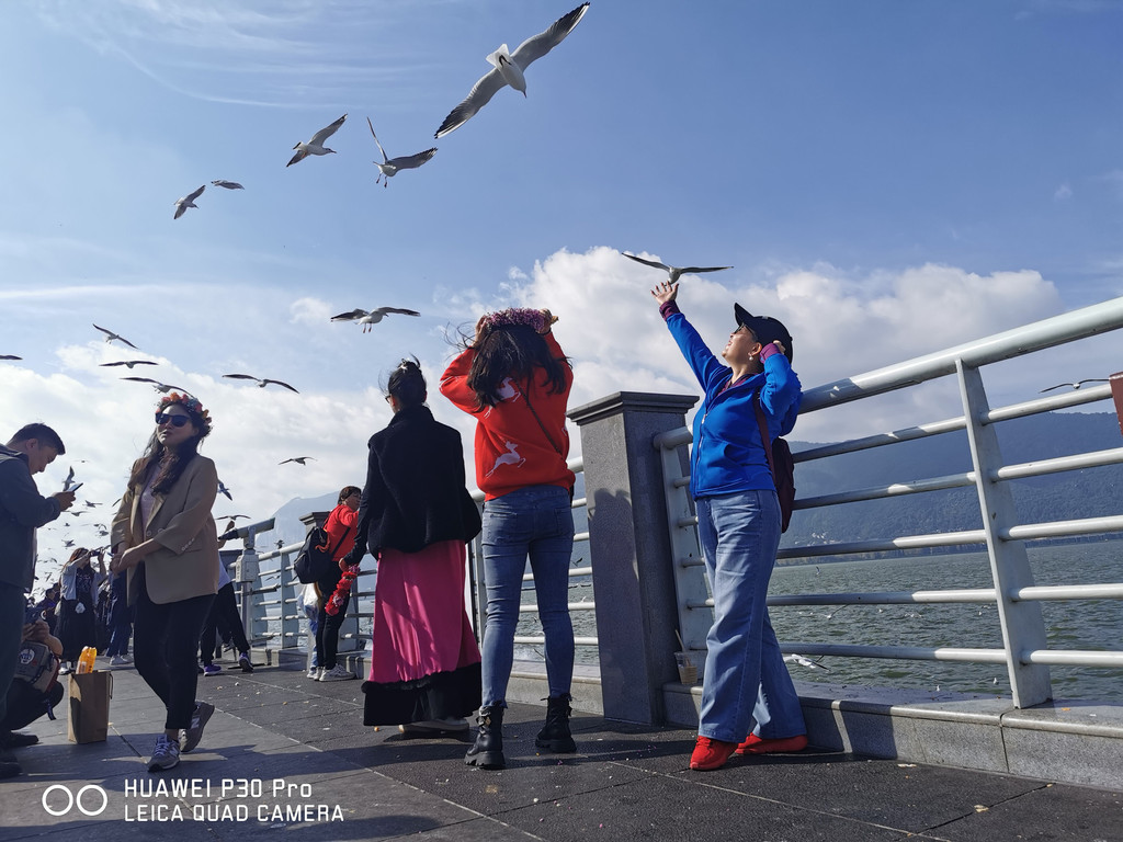 游览过大观公园,打车16来到海埂大坝,这是个绝佳的喂食观赏海鸥的地方。这里人头攒动,海鸥铺天盖地,人们手持面包与海鸥近距离友善接触,描绘出了一幅幅大自然和谐幸福的美景。