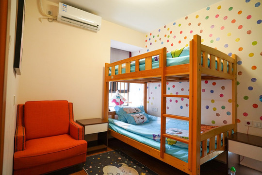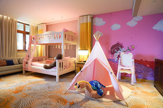 带娃家庭可以选择亲子主题房,粉色的高低床上有不同的抱枕,就连壁纸都是粉嫩嫩的颜色,整洁的被单上印着卡通人物,宝贝们肯定爱不释手。