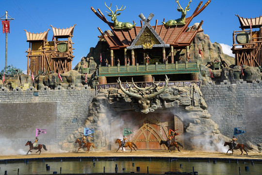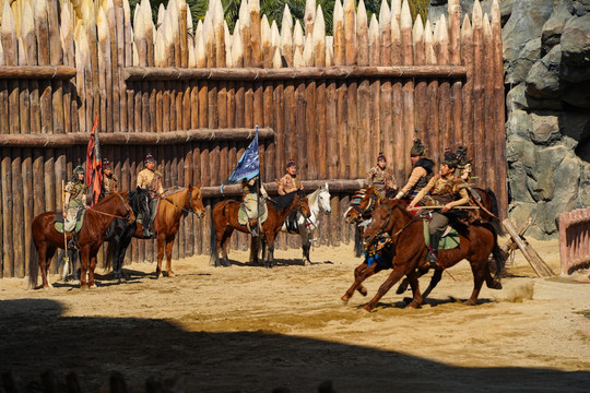 除了激烈的战斗场面,表演中还穿插了许多惊险刺激的特技表演。演员们吊威亚、“飞行”,展现出令人惊叹的高空技艺。同时,还有惊险刺激的骑马表演,演员们在高速奔跑的马背上完成各种高难度动作,让人捏一把冷汗。