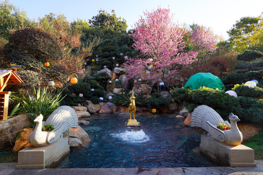 昭 阳泉 位于靠近山庄正门“古滇秘境”区,天然的高温碳酸温泉,池岸绿树环合,池内奇石、花草、泉水涌动,“如意瑞鹿”与“吉祥孔雀”卓然而立。象征着前来的游客吉祥如意幸 福安 康。