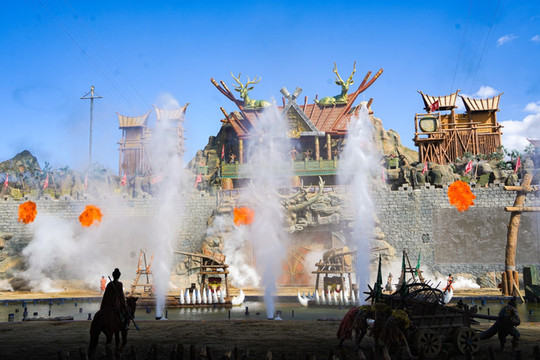 丰富多彩的演出节目是的七彩 云南 ·欢乐世界旅游亮点,这里每天有十多场演出、歌舞、影视特技类的节目连续上演。要说最具代表性的,那一定是《古滇风云录》。以两千年前的古滇国与周边部族战争为背景的特效实景大戏。