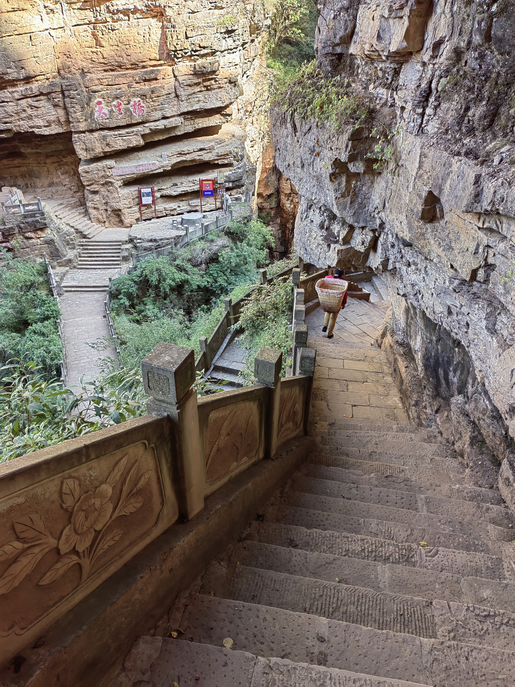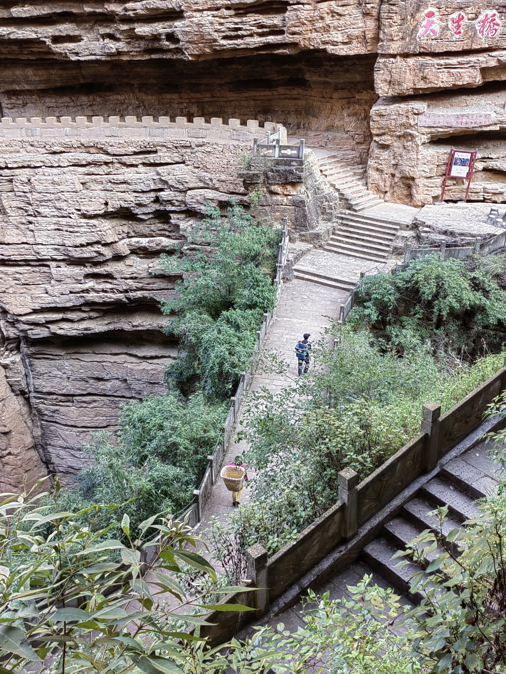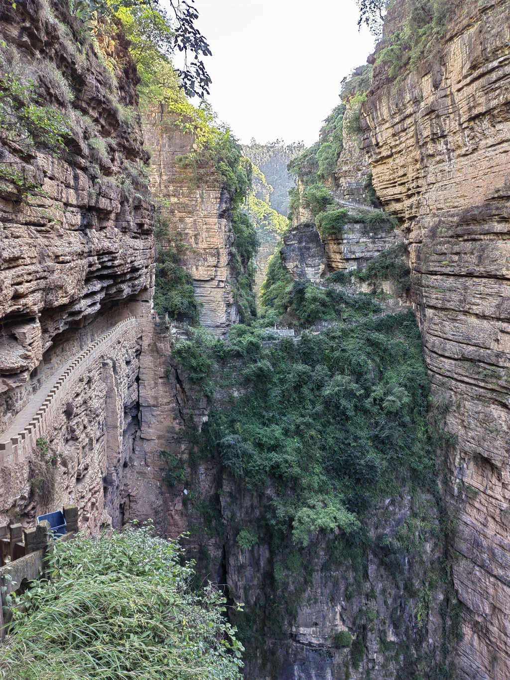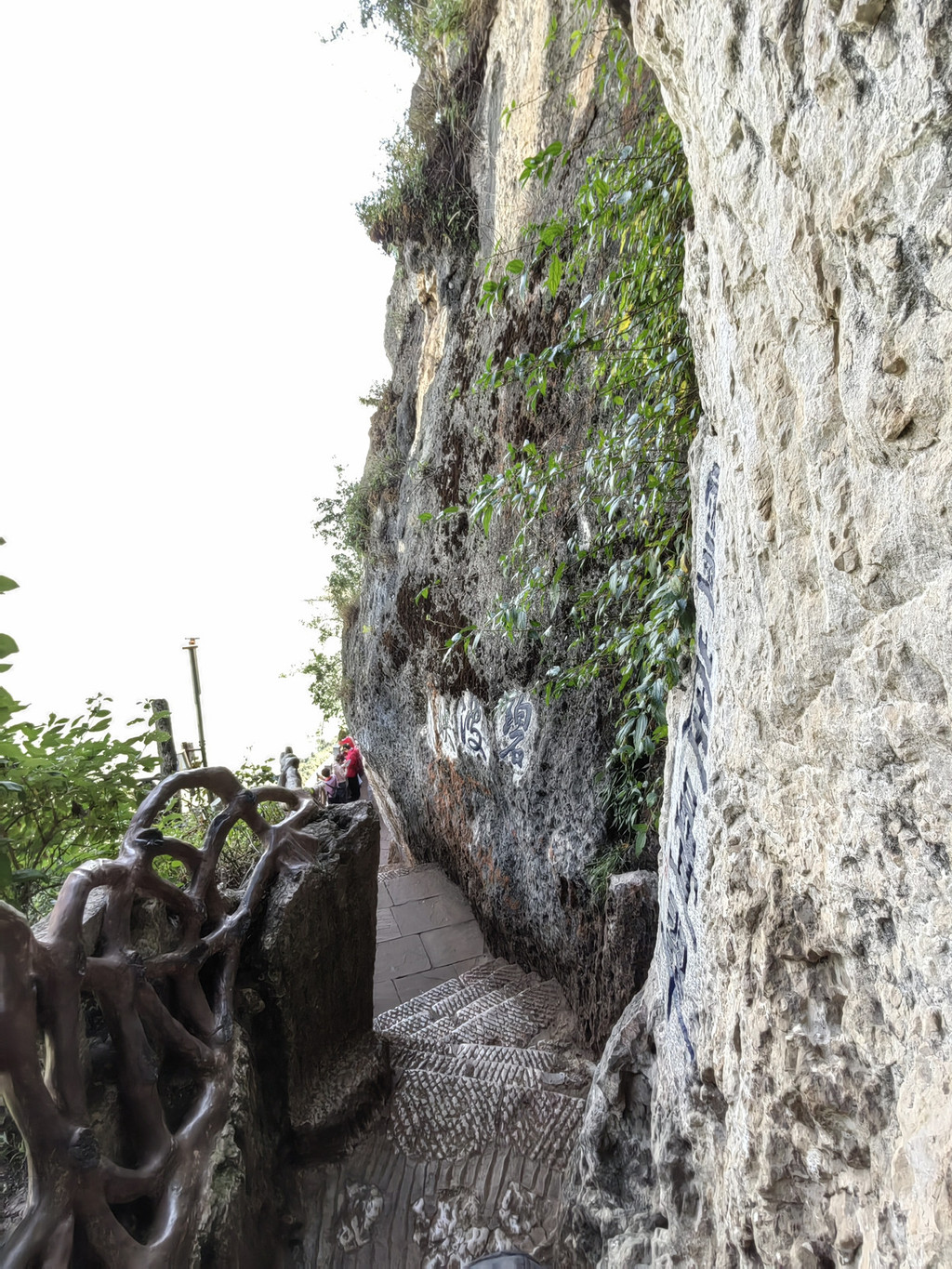 全程的台阶步道都在这种直上直下的悬崖绝壁之上。我们与大多数游客都是从上向下走,但也有不少人从下向上走,因石阶栈道很窄,许多地方两人相遇须侧身方可交错而过。