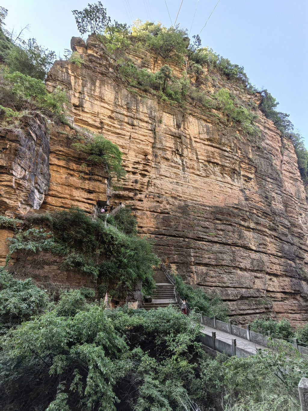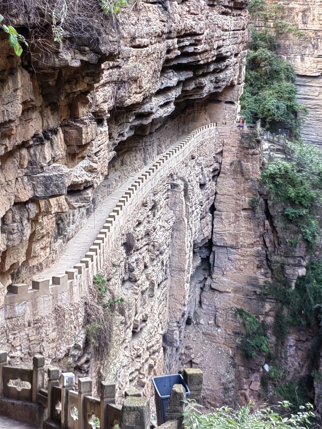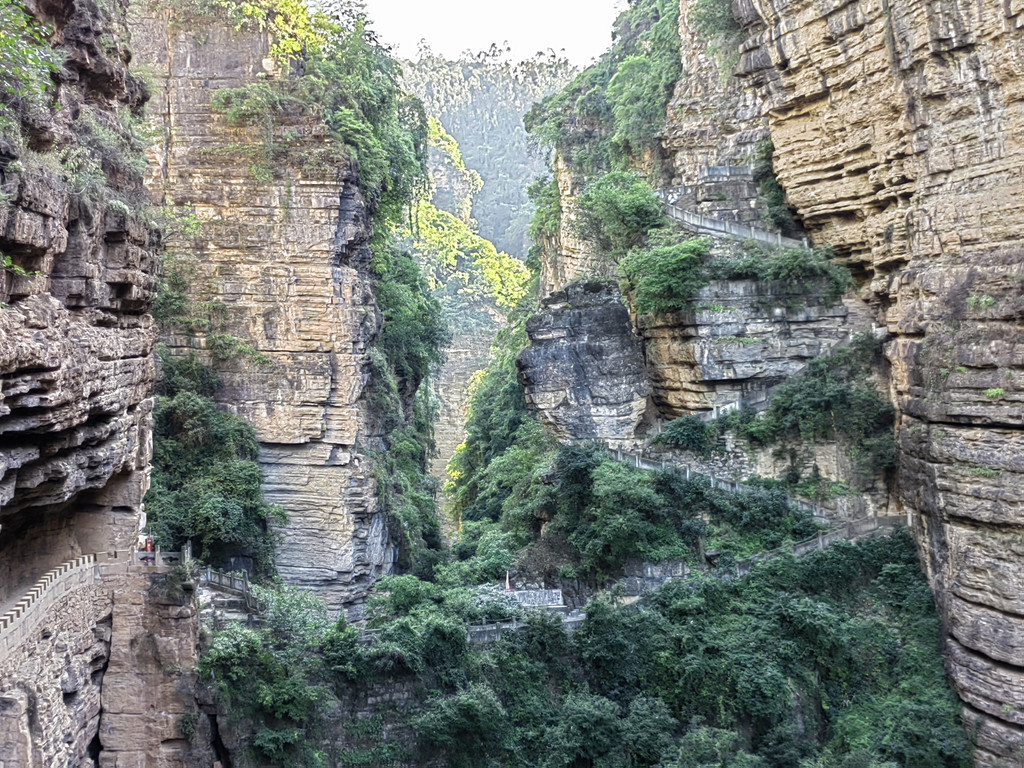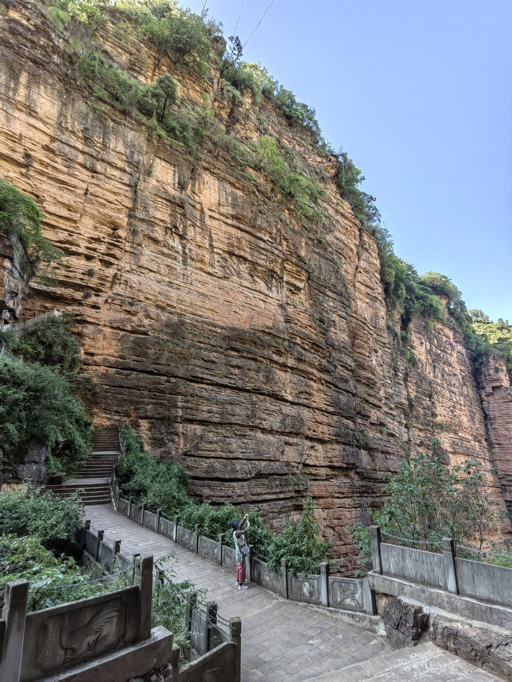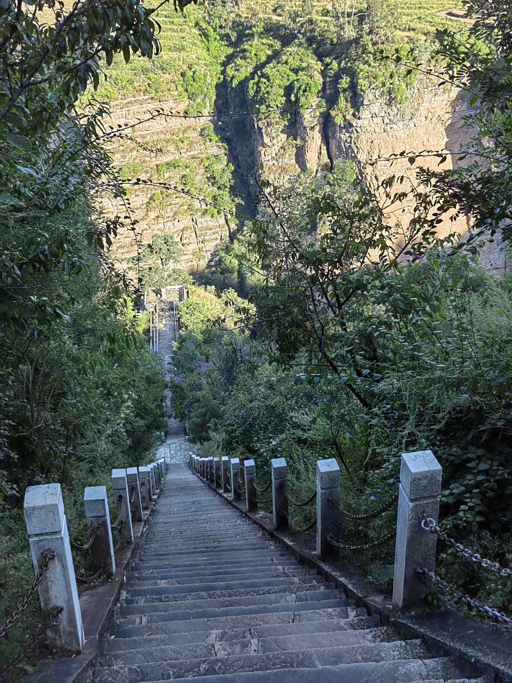 全程的台阶步道都在这种直上直下的悬崖绝壁之上。我们与大多数游客都是从上向下走,但也有不少人从下向上走,因石阶栈道很窄,许多地方两人相遇须侧身方可交错而过。