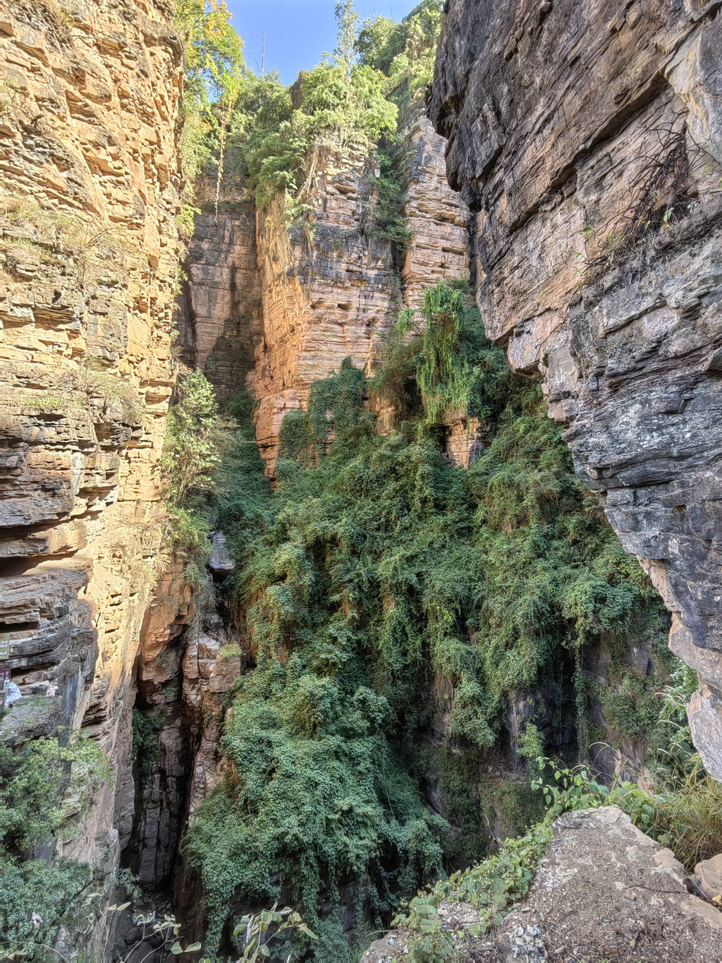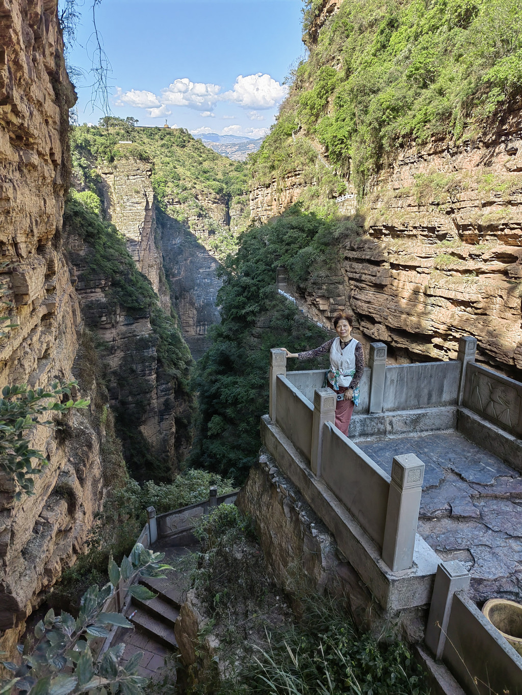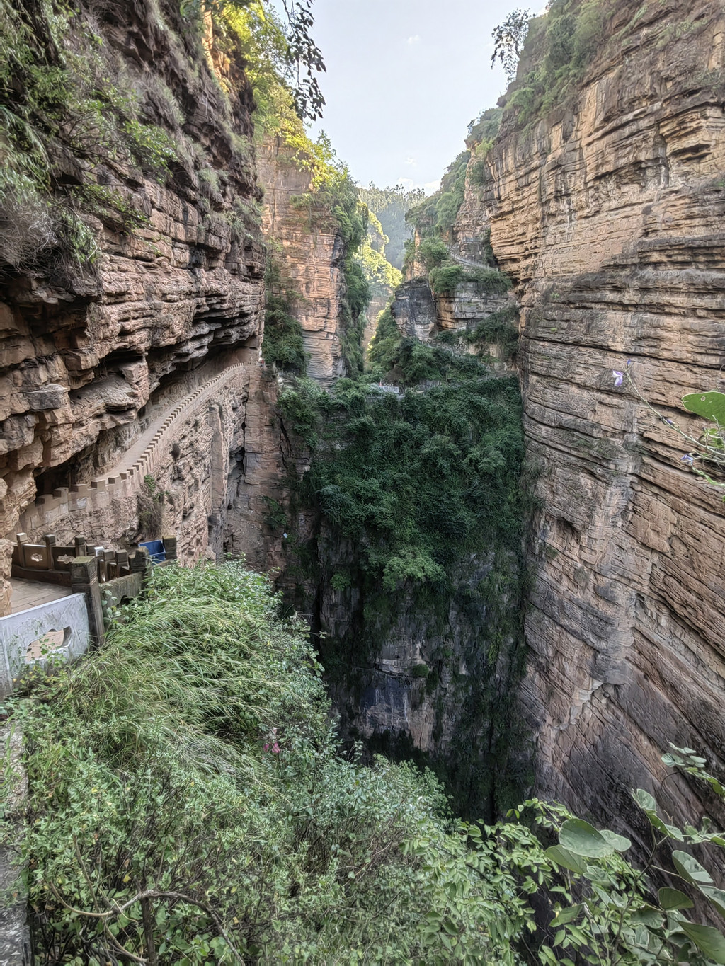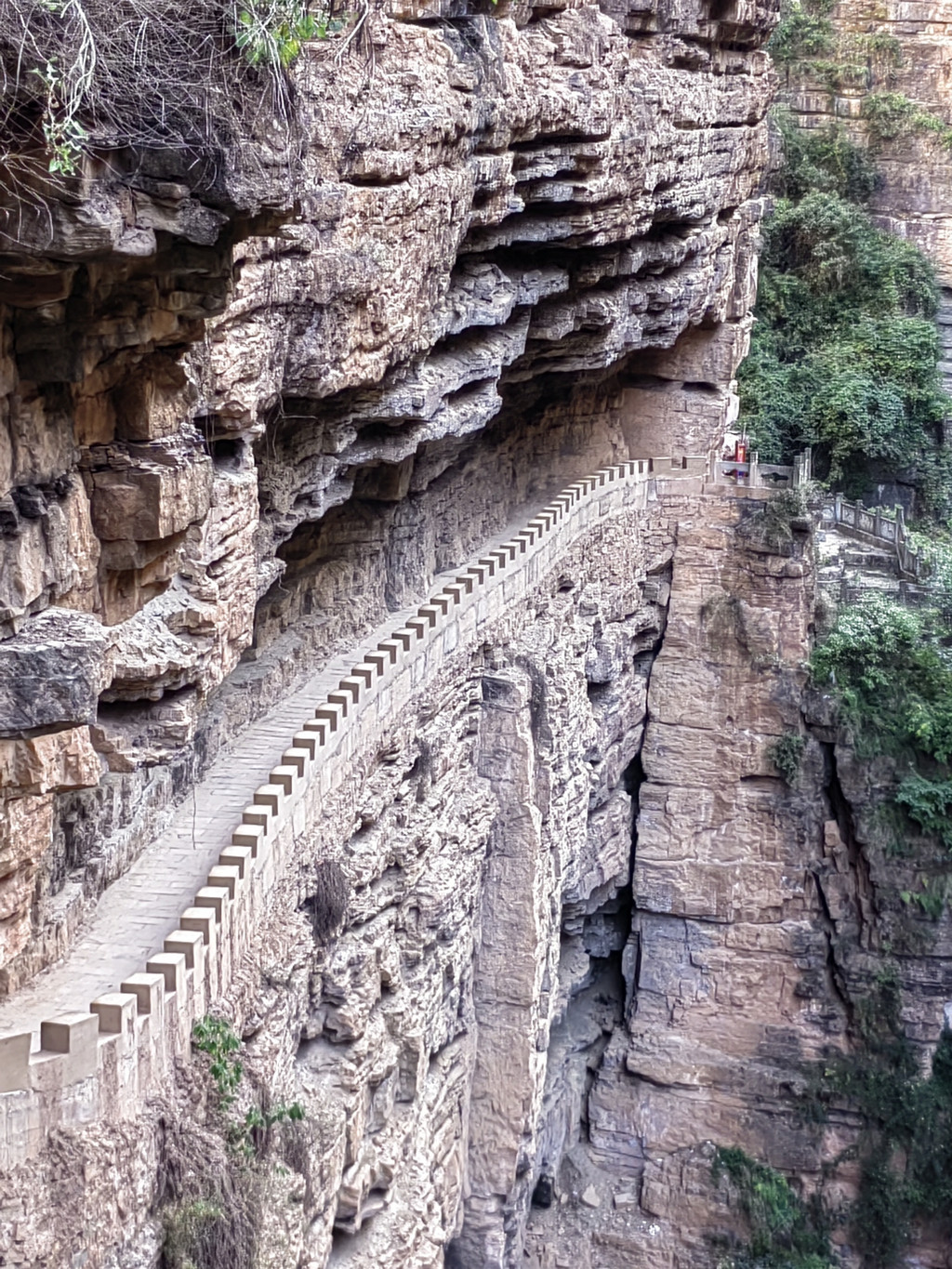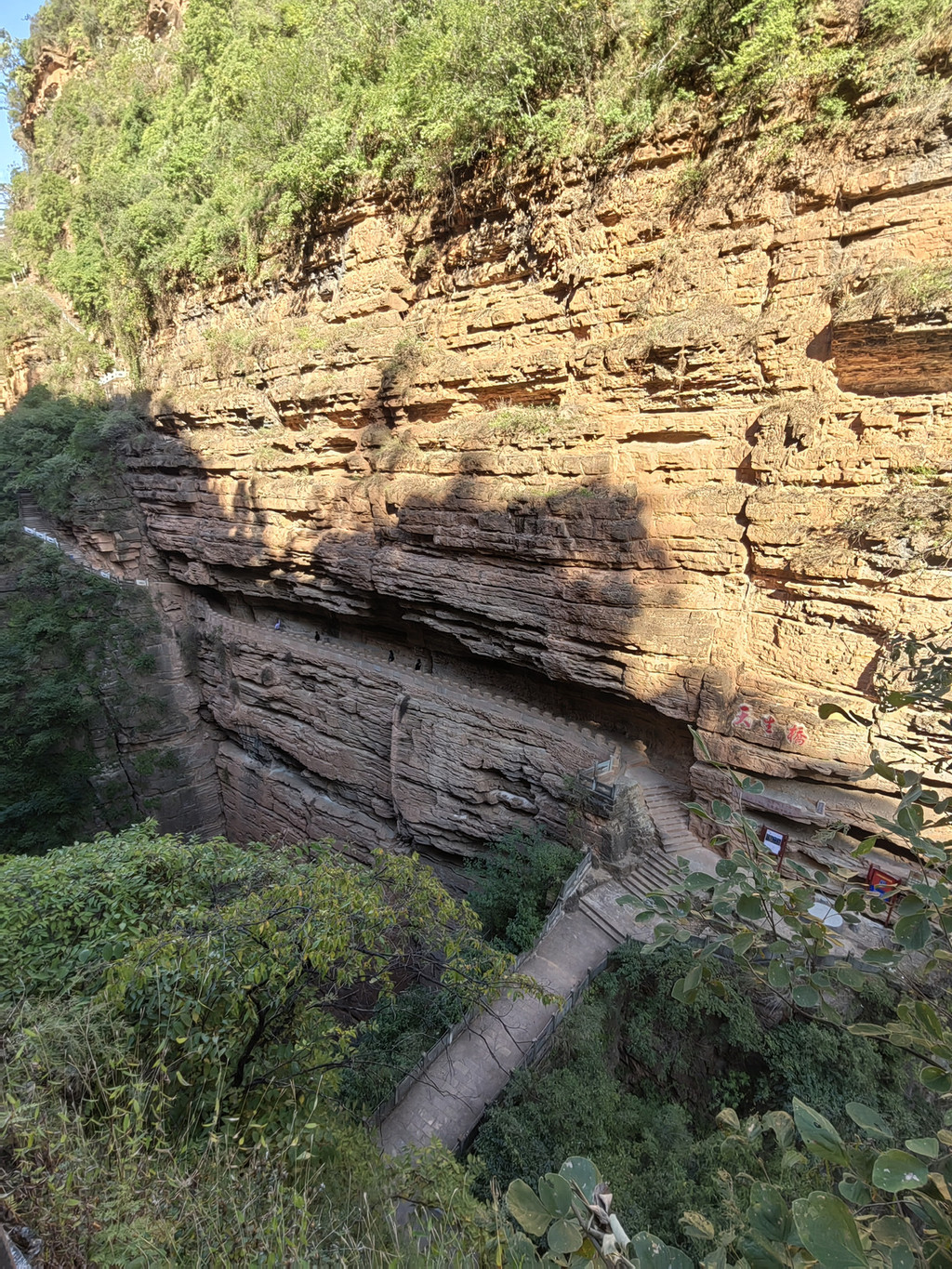 全程的台阶步道都在这种直上直下的悬崖绝壁之上。我们与大多数游客都是从上向下走,但也有不少人从下向上走,因石阶栈道很窄,许多地方两人相遇须侧身方可交错而过。
