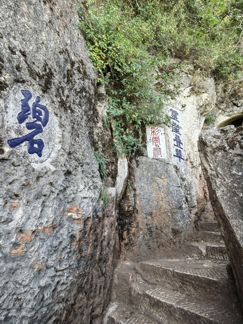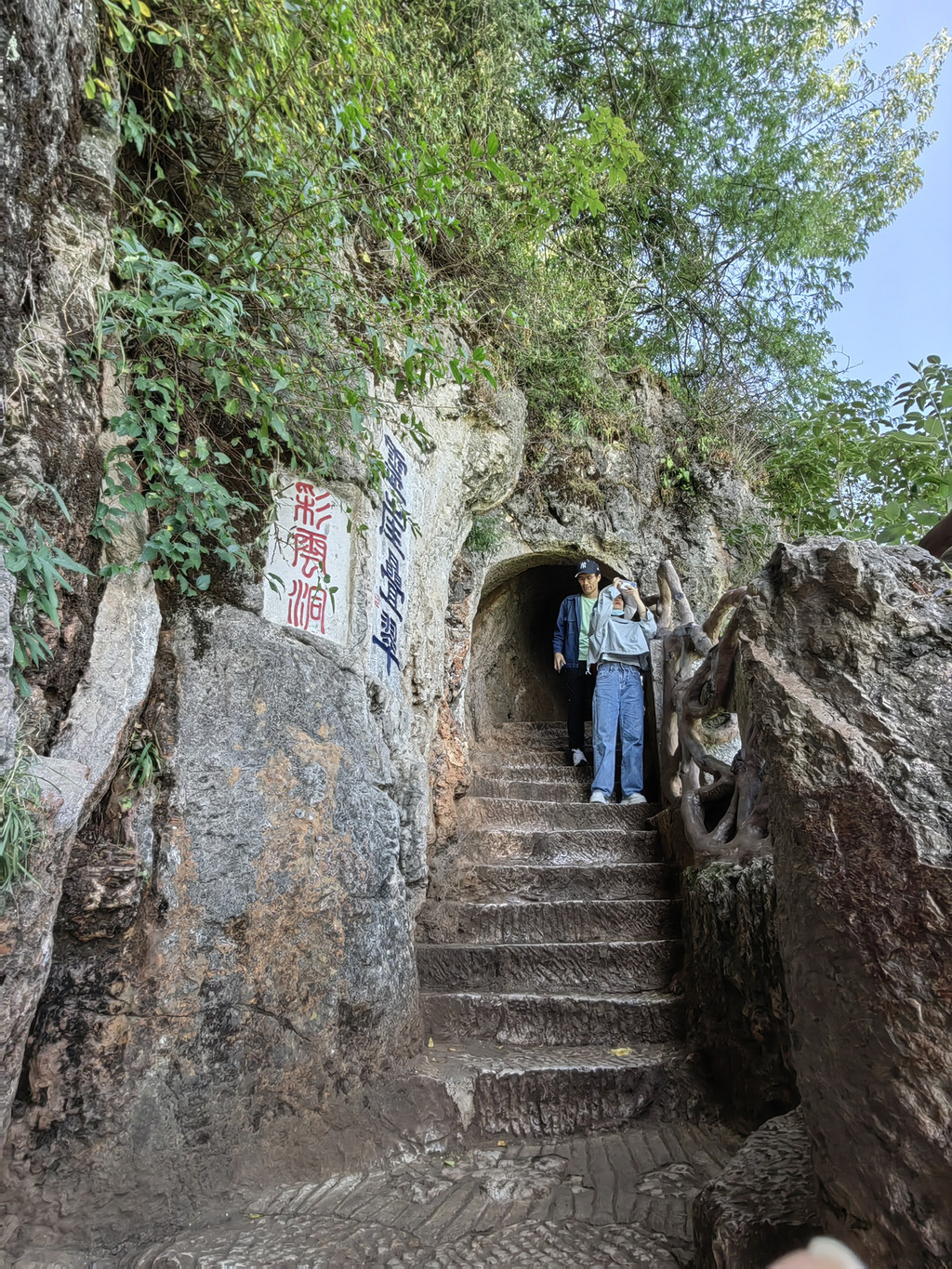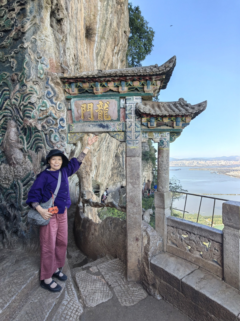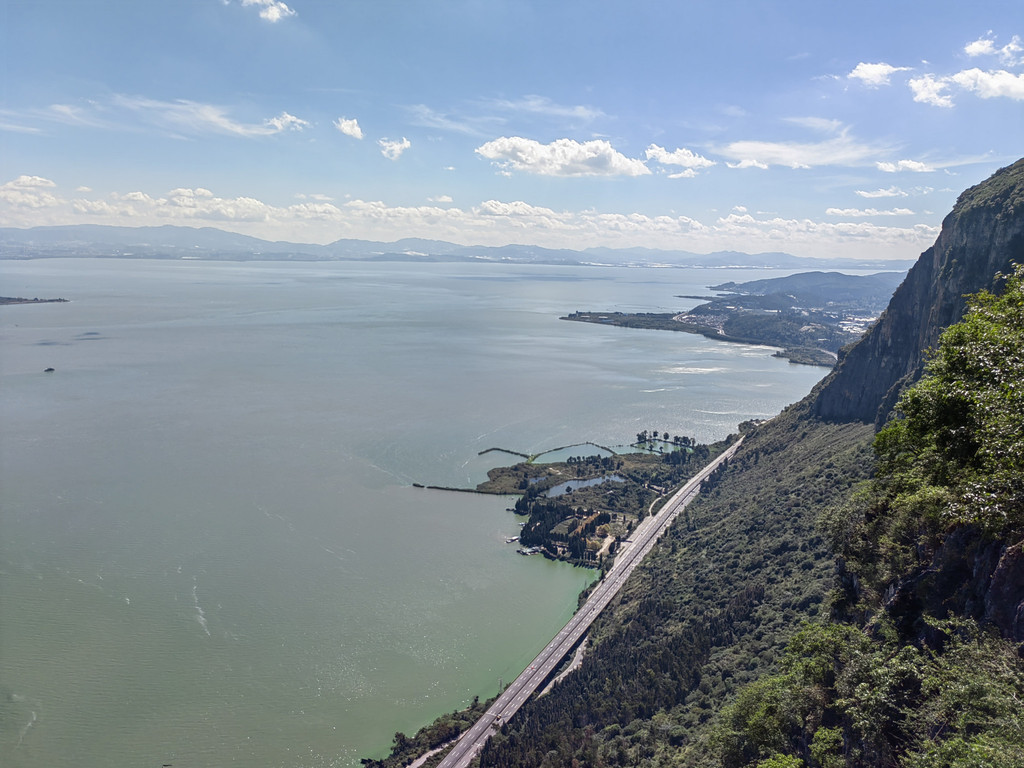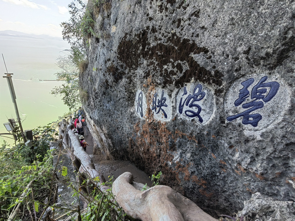 下行出了龙门景区再走不远便可抵达景区交通车候车处,从这里乘车返回北门,也可步行下山回北门。不过,我们没有返回北门,而是拐到主栈道右侧的千步岩,这里有一条下山的石阶路,通往西山景区的东门。从东门出去,就可以经海埂长堤步行横跨滇池到达东岸。