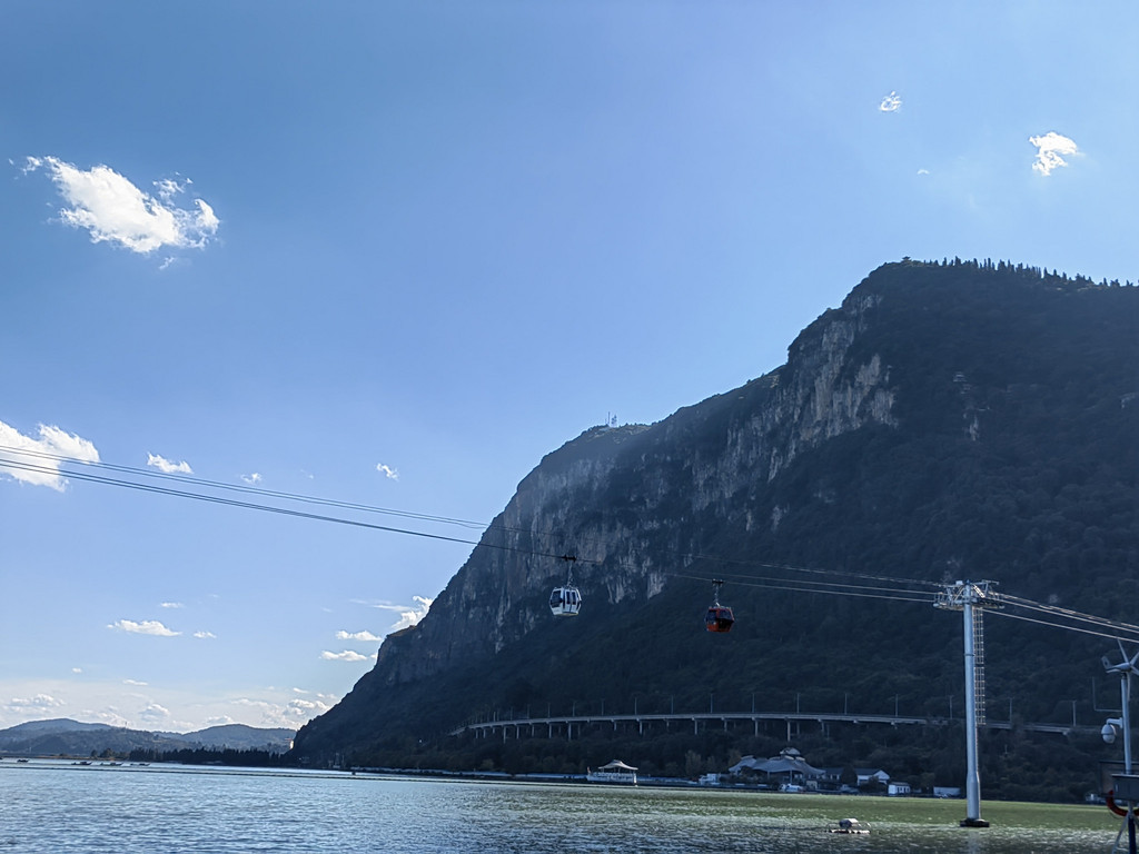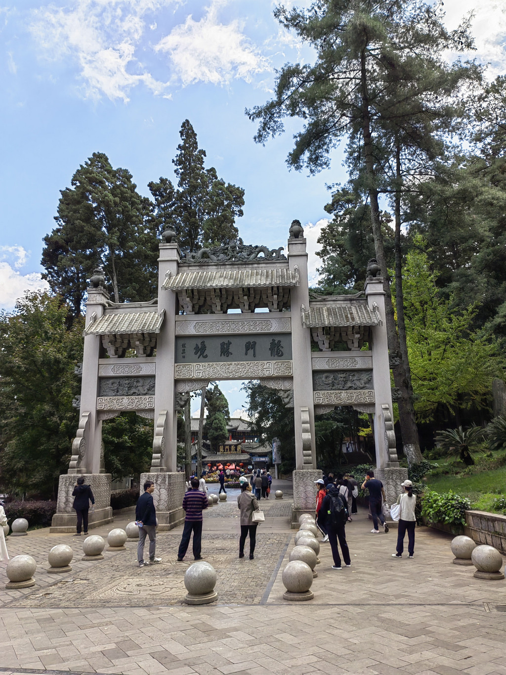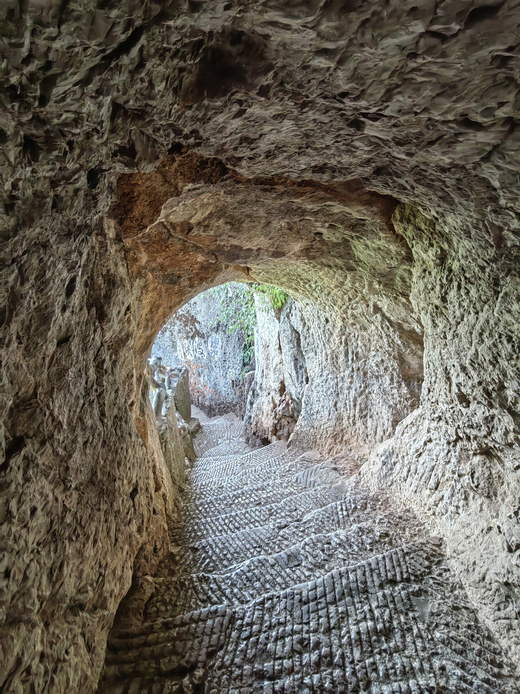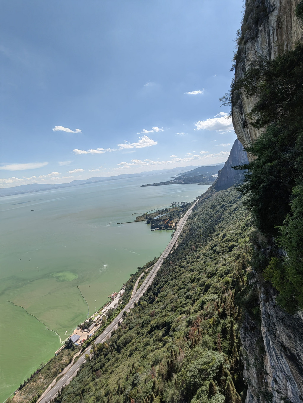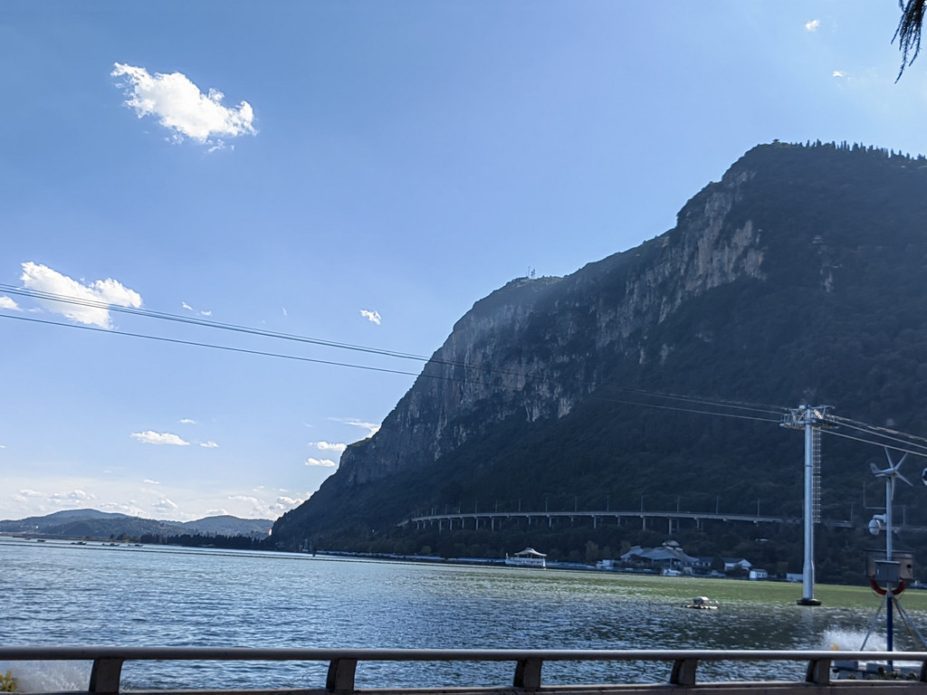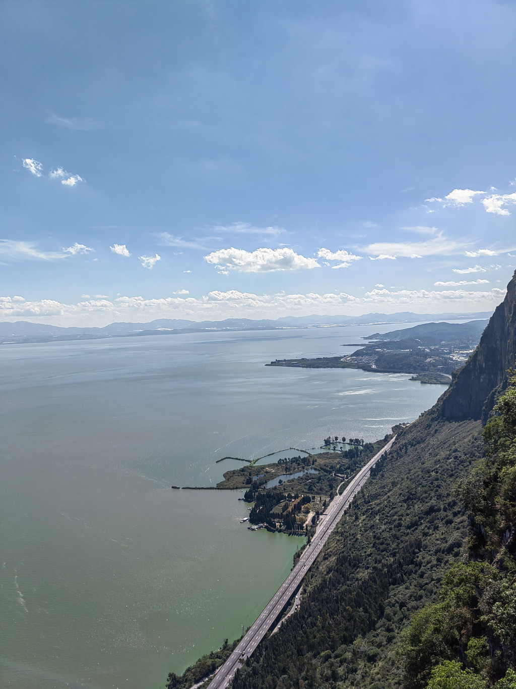 下行出了龙门景区再走不远便可抵达景区交通车候车处,从这里乘车返回北门,也可步行下山回北门。不过,我们没有返回北门,而是拐到主栈道右侧的千步岩,这里有一条下山的石阶路,通往西山景区的东门。从东门出去,就可以经海埂长堤步行横跨滇池到达东岸。