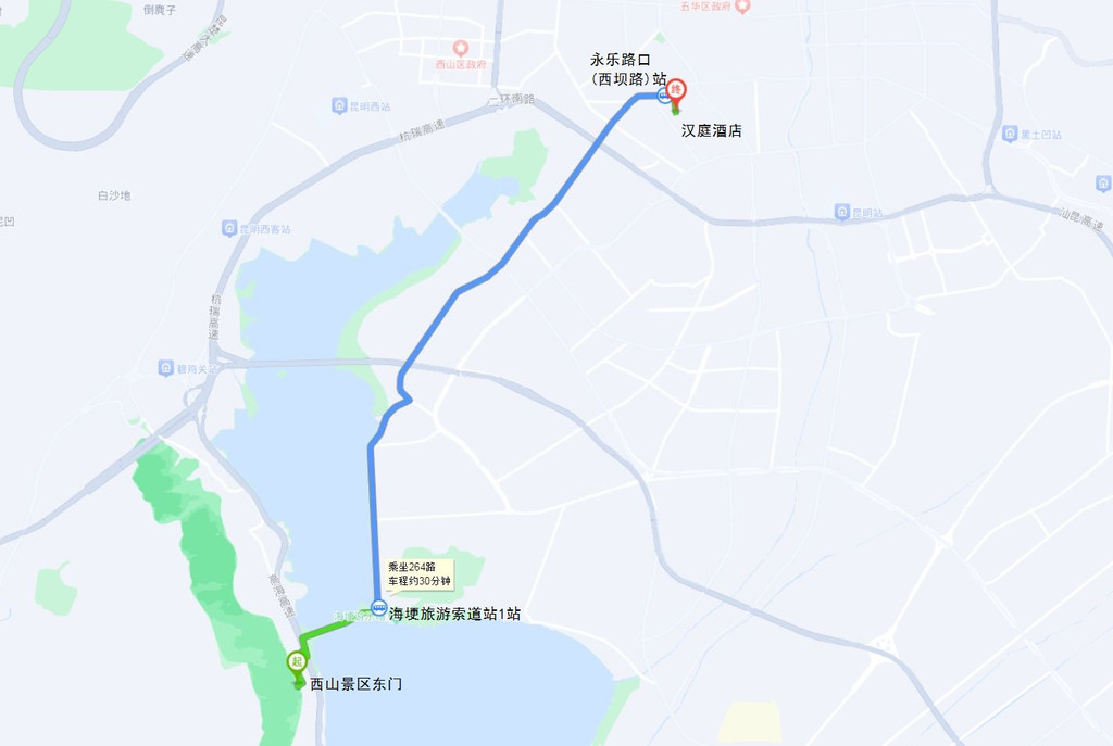 返程:西山景区东门步行→ 公交海埂旅游索道站1站→ 264路公交车 →永乐路口(西坝路)站 → 步行至 汉庭酒店(昆明弥勒寺公园店),里程:13.1公里 | 步行3.1公里。